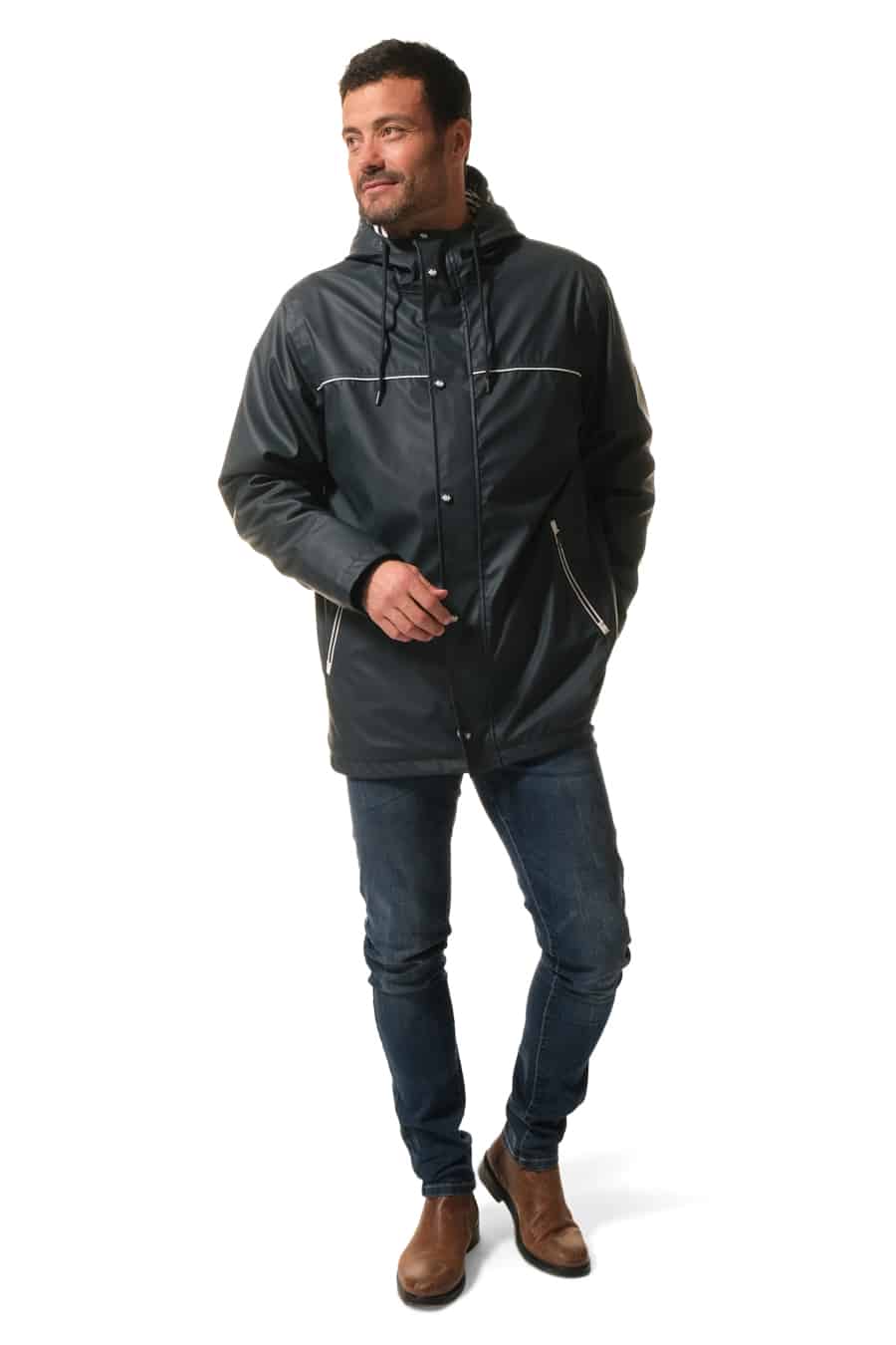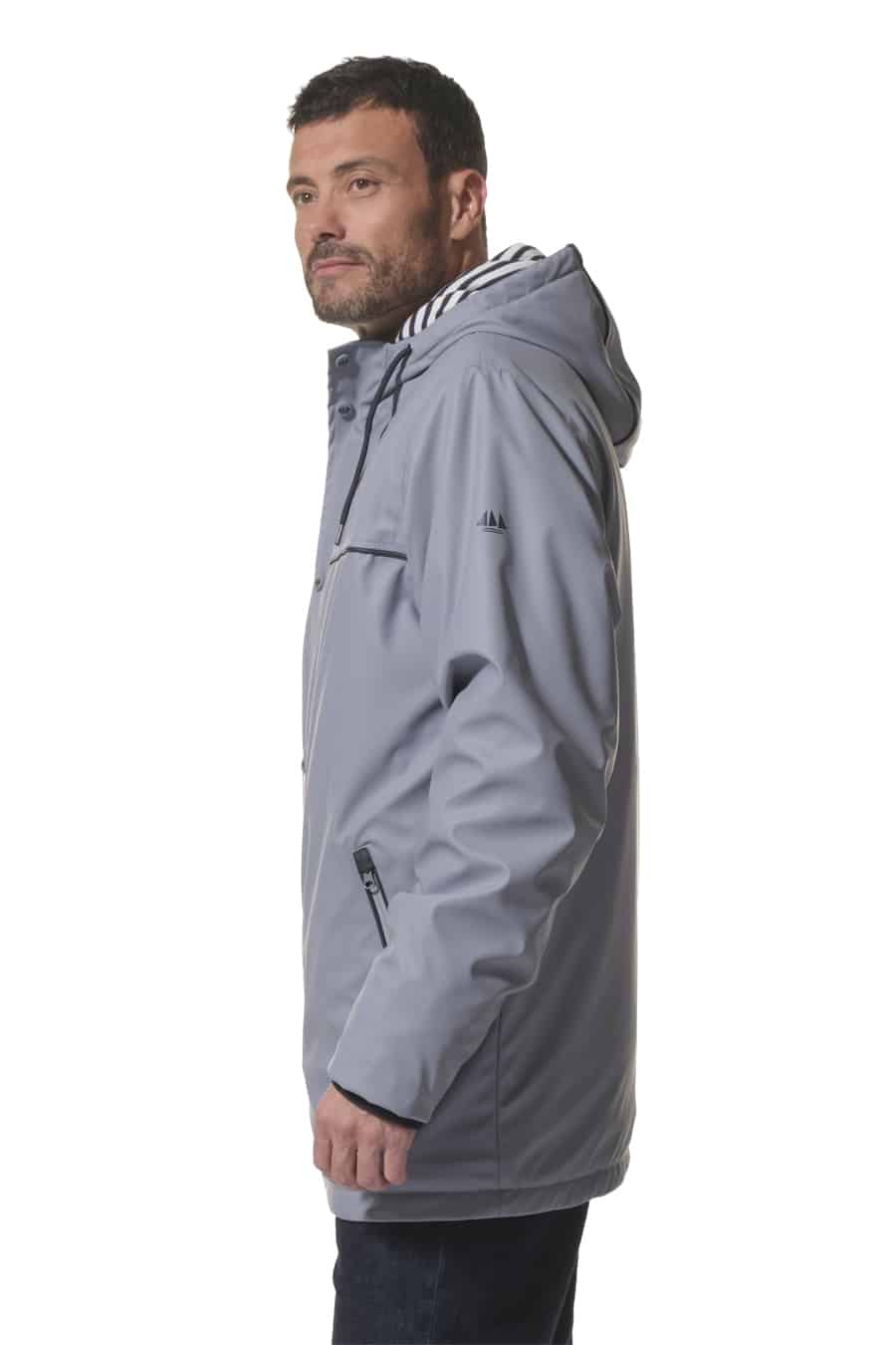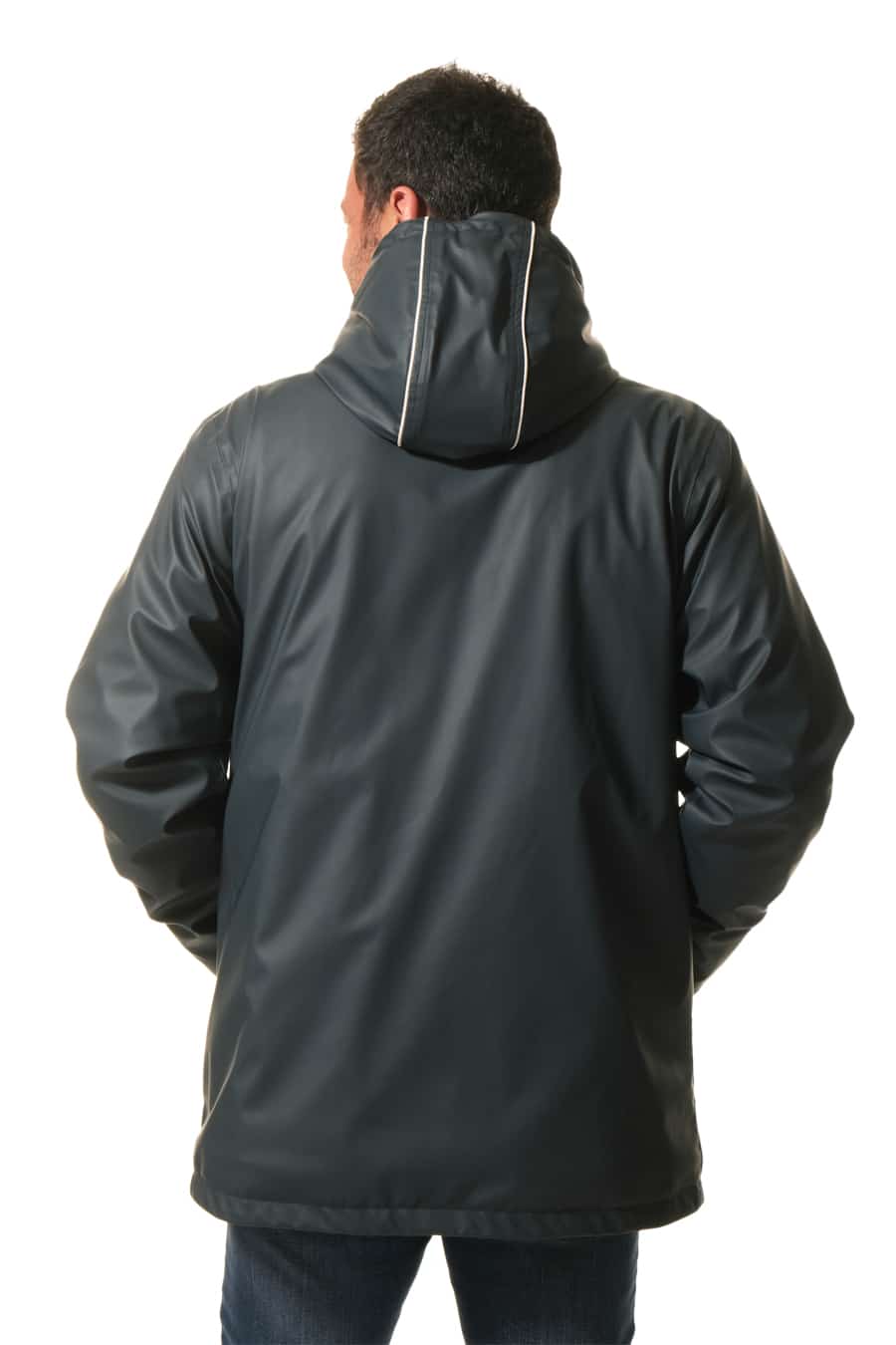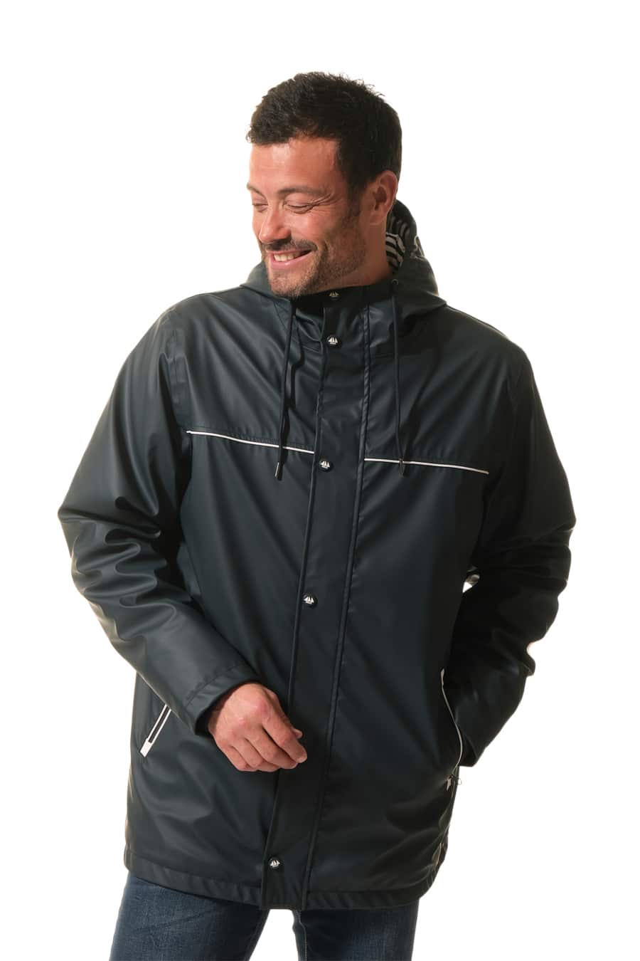 Description: Fleece-lined, waterproof marine raincoat with hood, zip and press stud fastening and non-return sleeves.