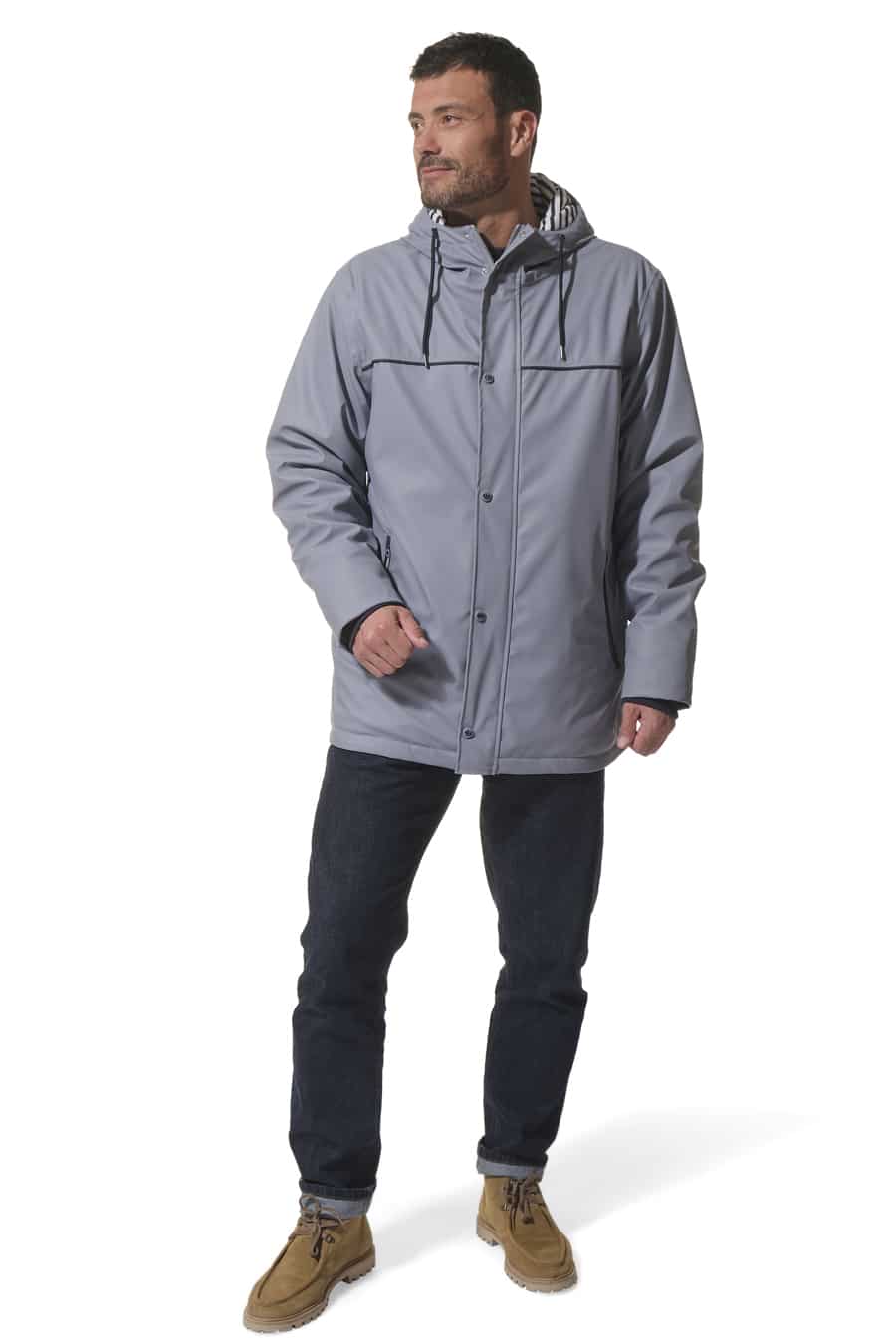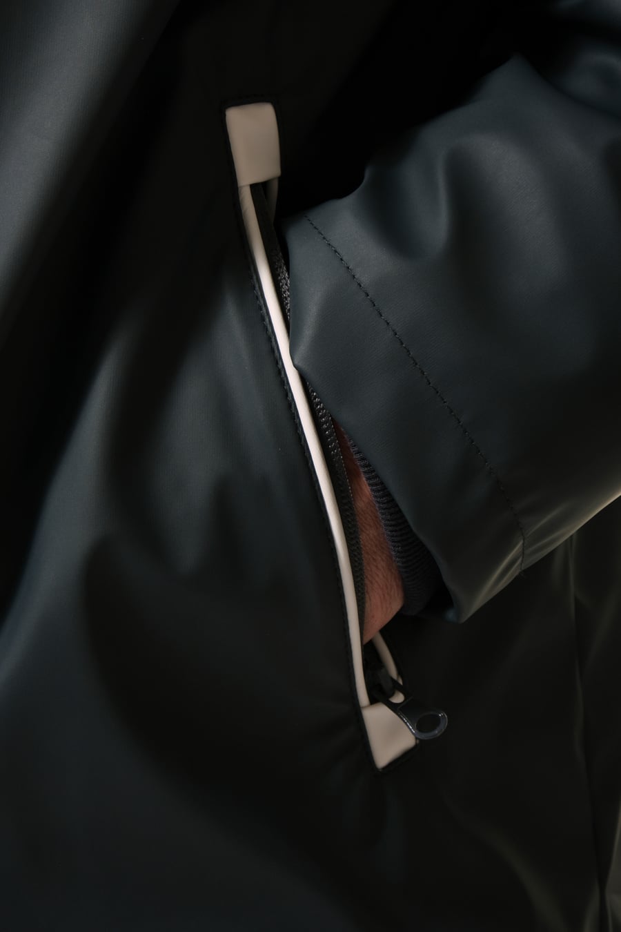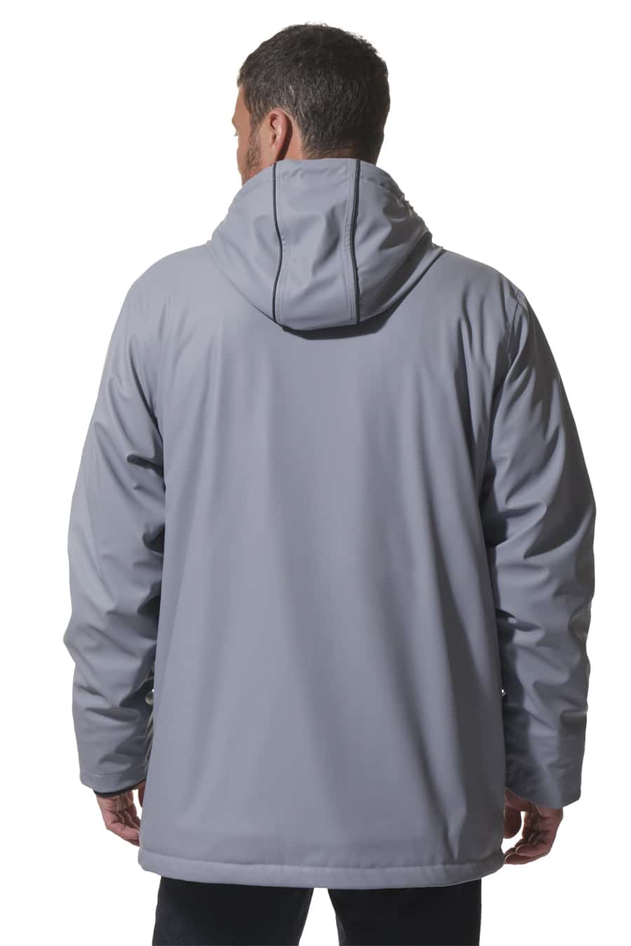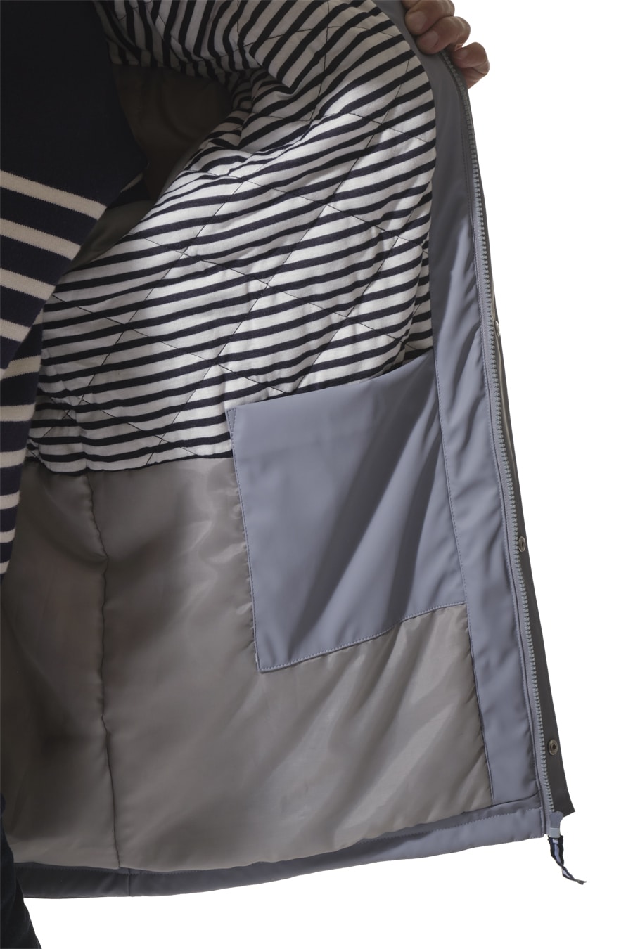 Description: Fleece-lined, waterproof marine raincoat with hood, zip and press stud fastening and non-return sleeves.