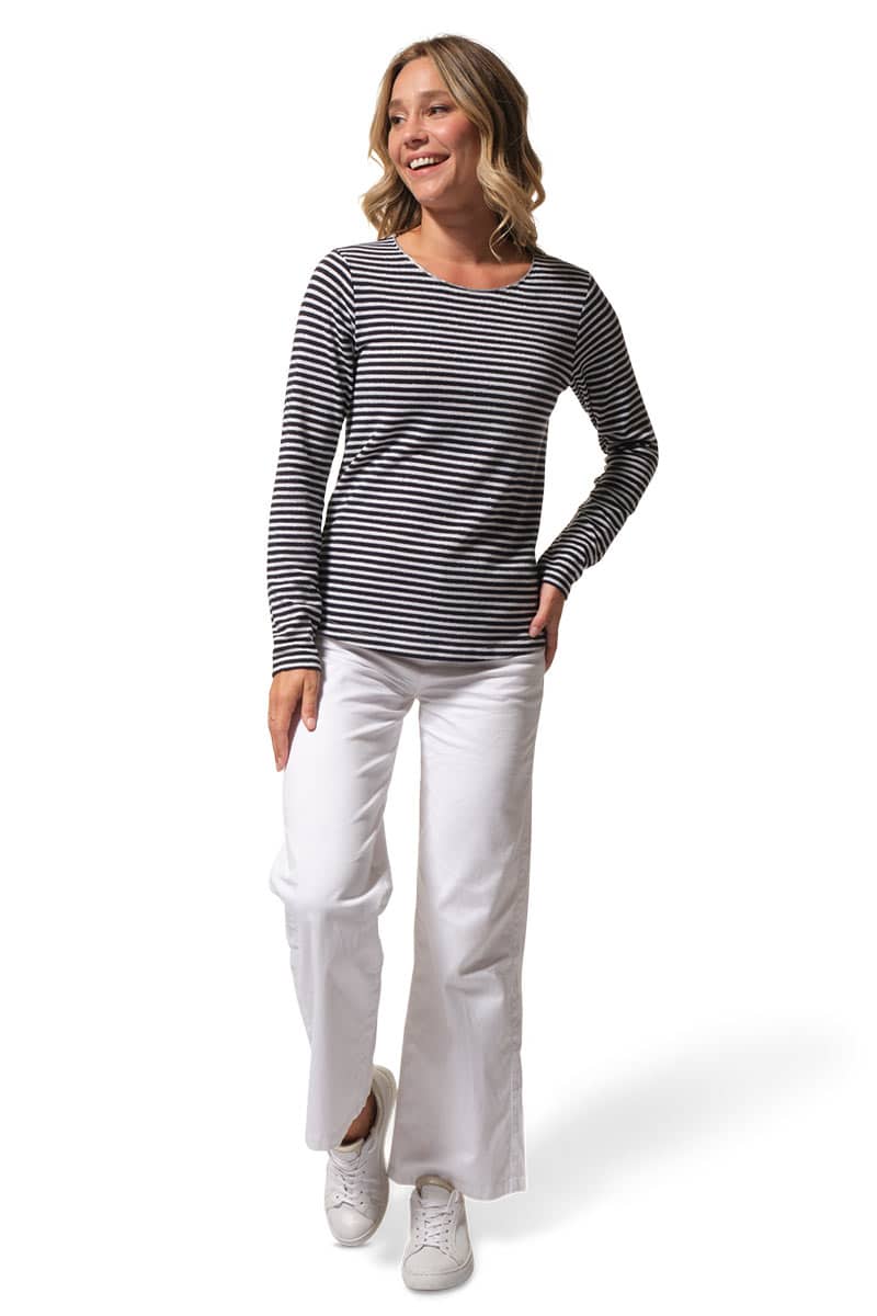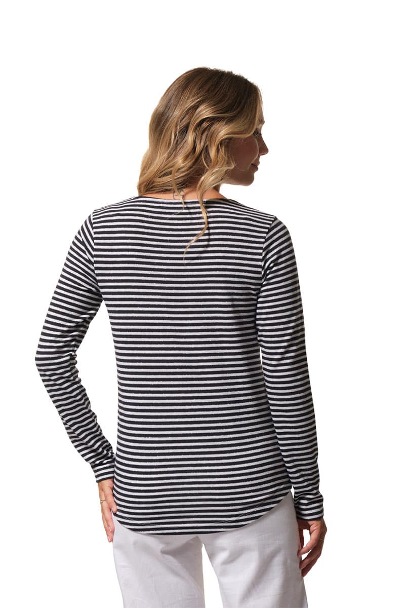 Description : tee-shirt manches longues à col rond avec des fines rayures métallisées.