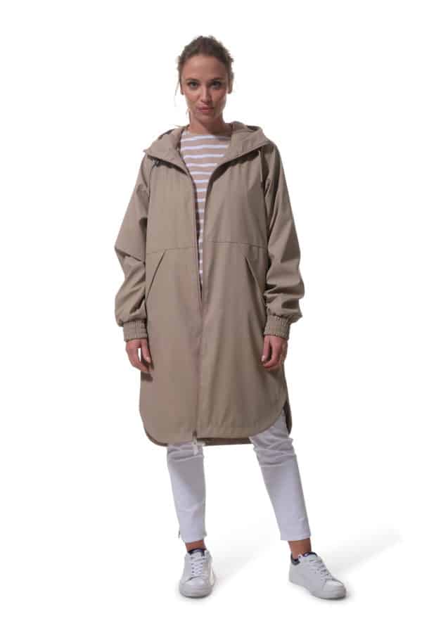 Description: Long raincoat with large pockets, mesh lining, raglan sleeves and back flap.