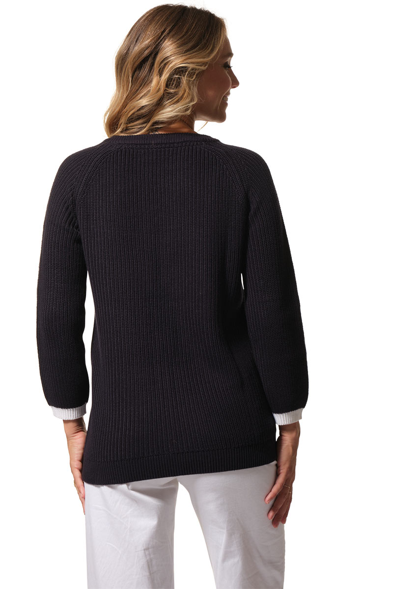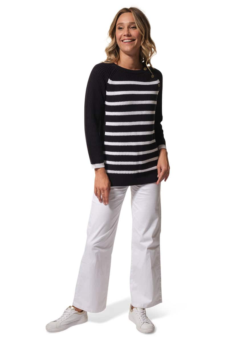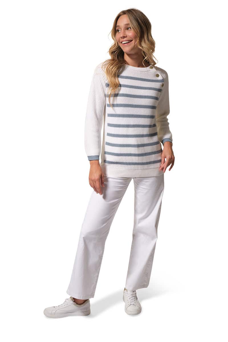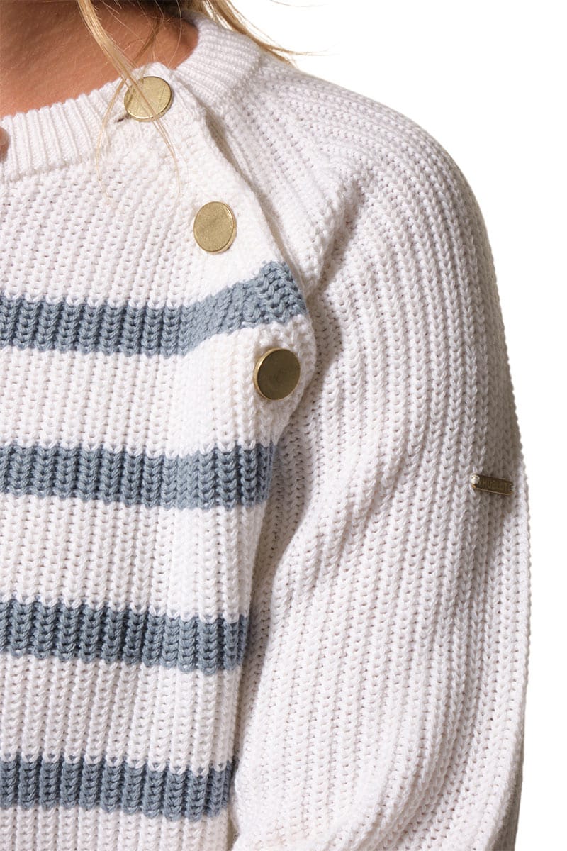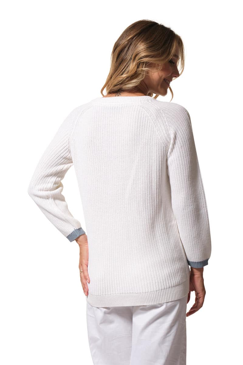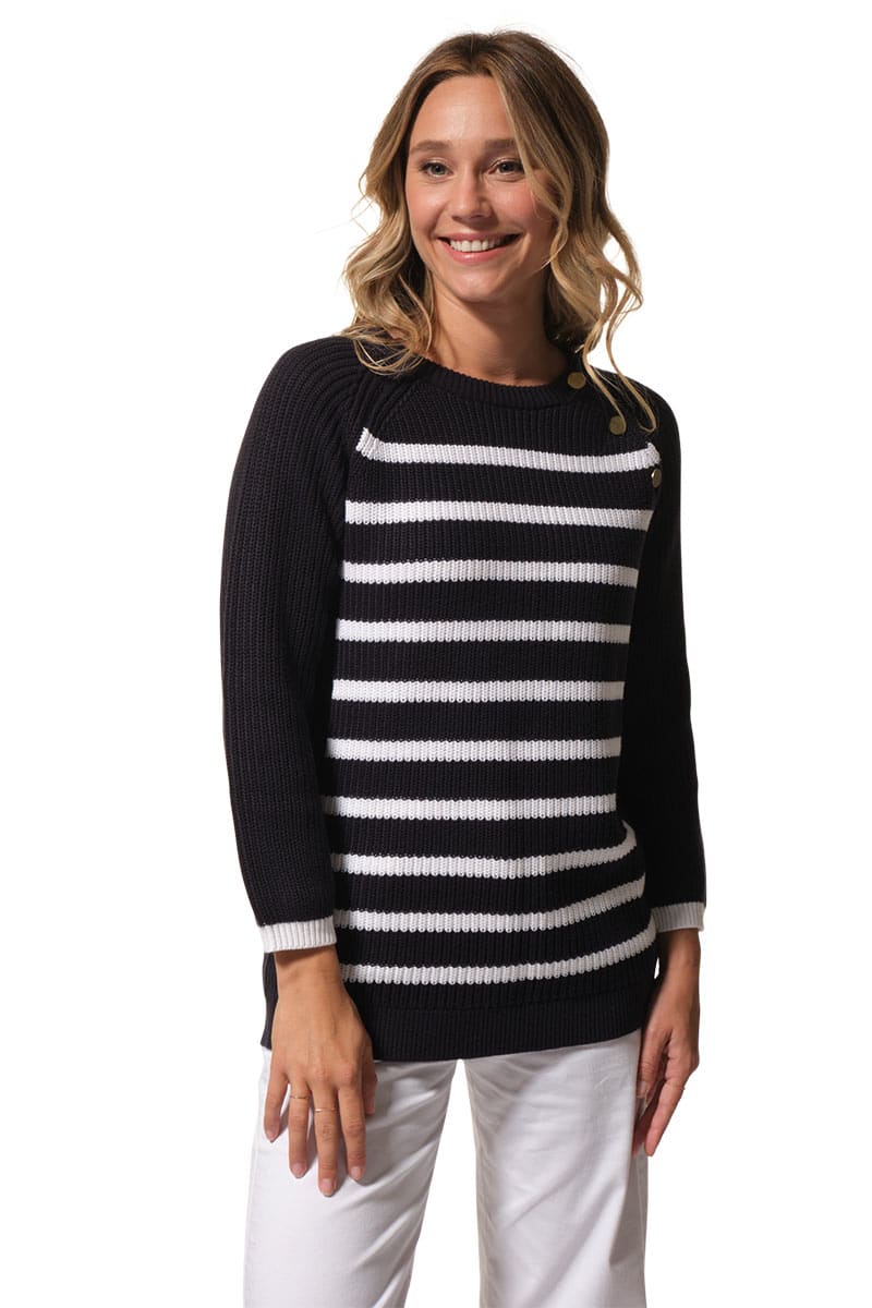 Description : pull col rond avec des boutons fantaisies aux épaules raglantes.