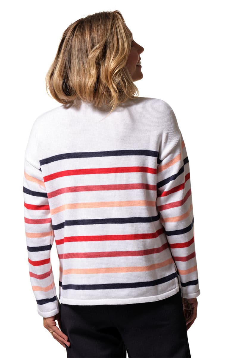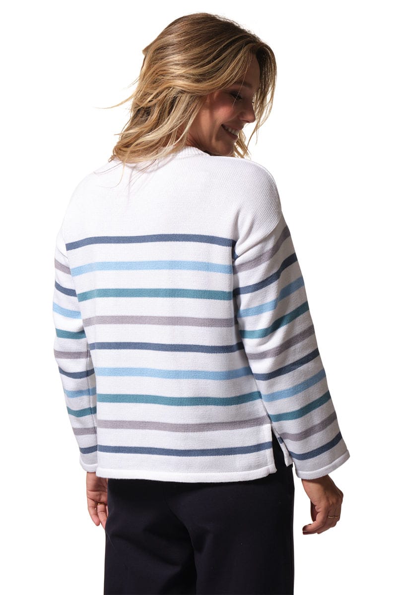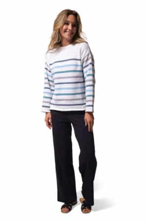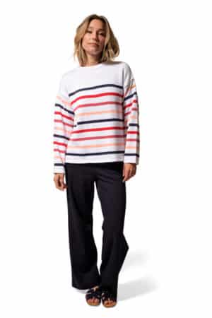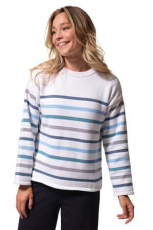 Description : Pull marin à encolure ronde avec des fentes sur le côté.