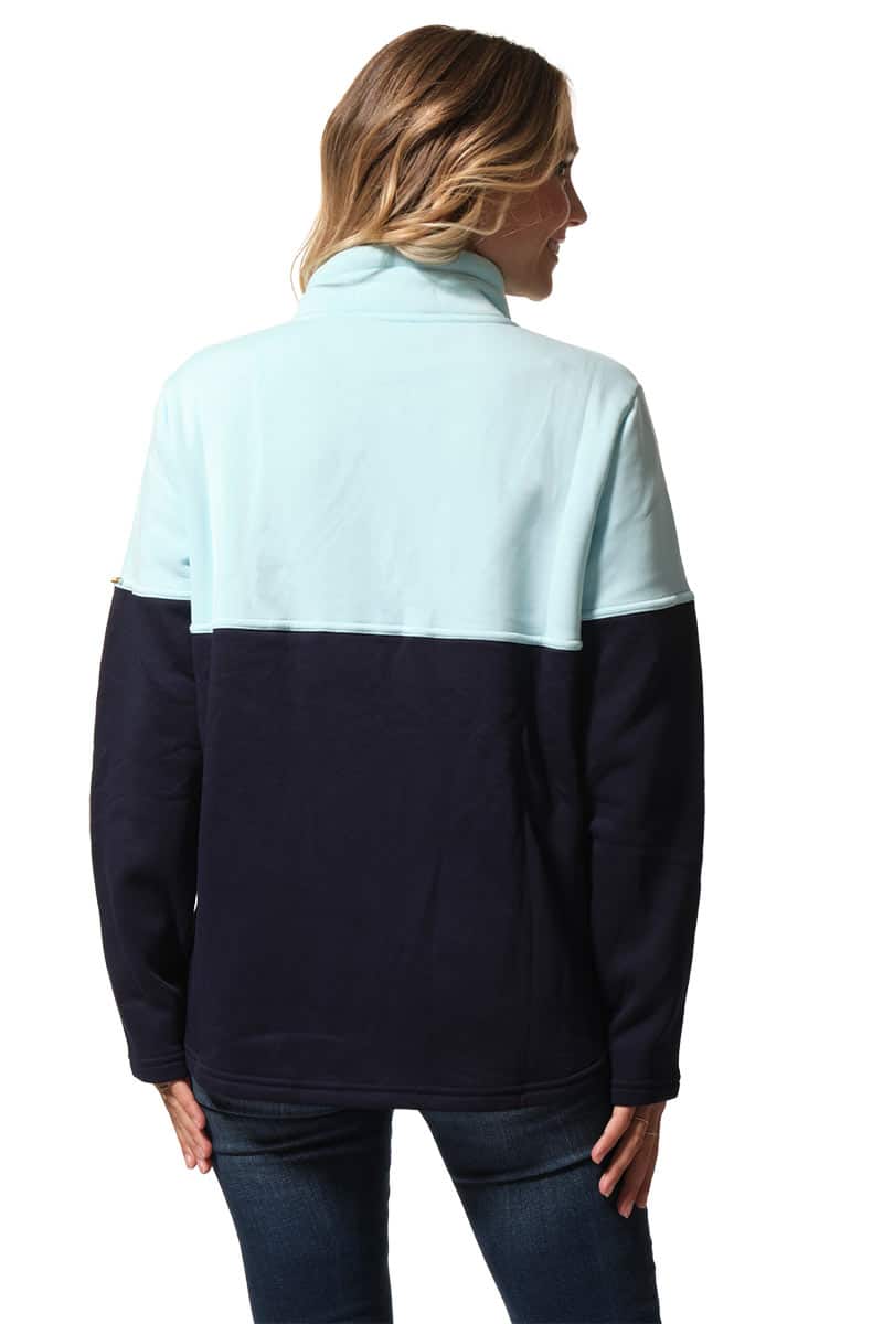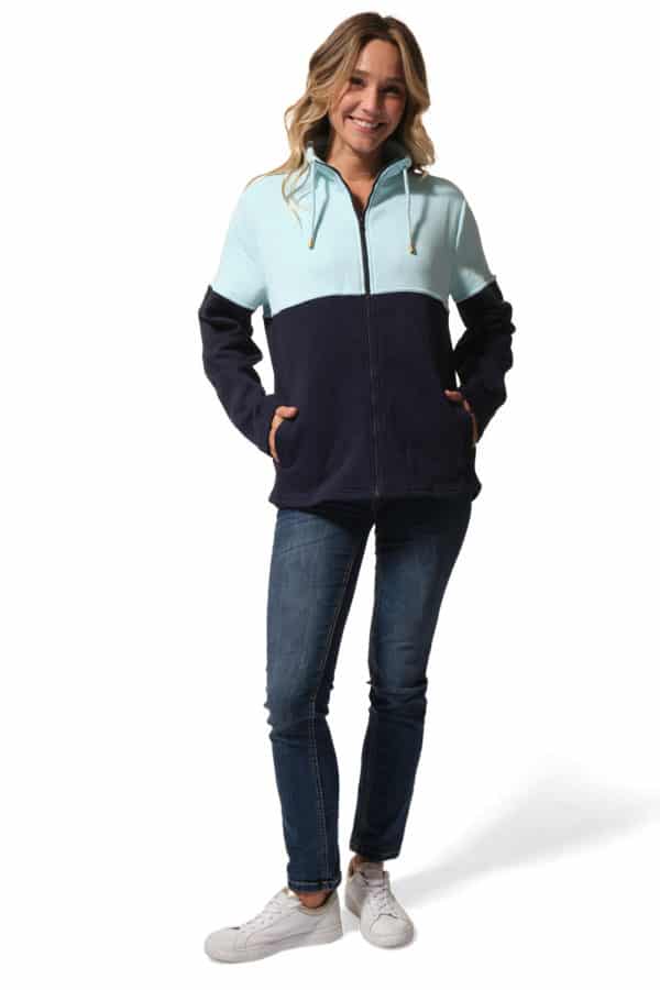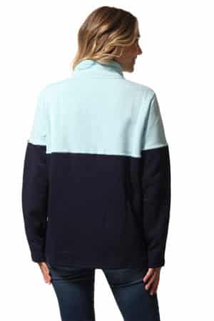 Description: two-tone sweatshirt with a coloured upper section and a navy lower section, zipped with a high collar and fancy laces.