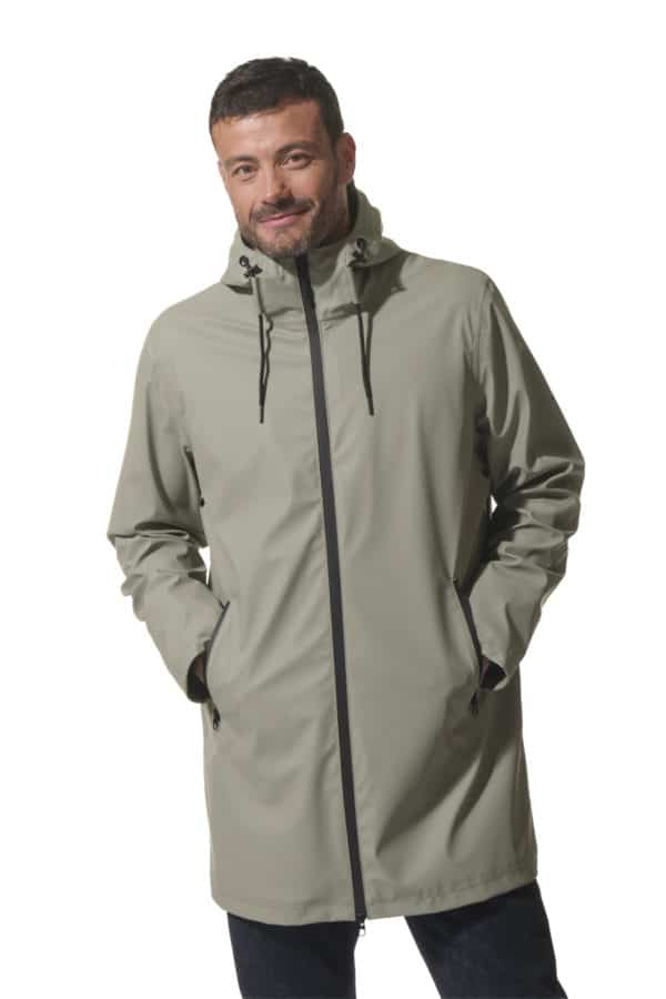 Description: Long, hooded raincoat with zip fastening, lined with micro-fleece.