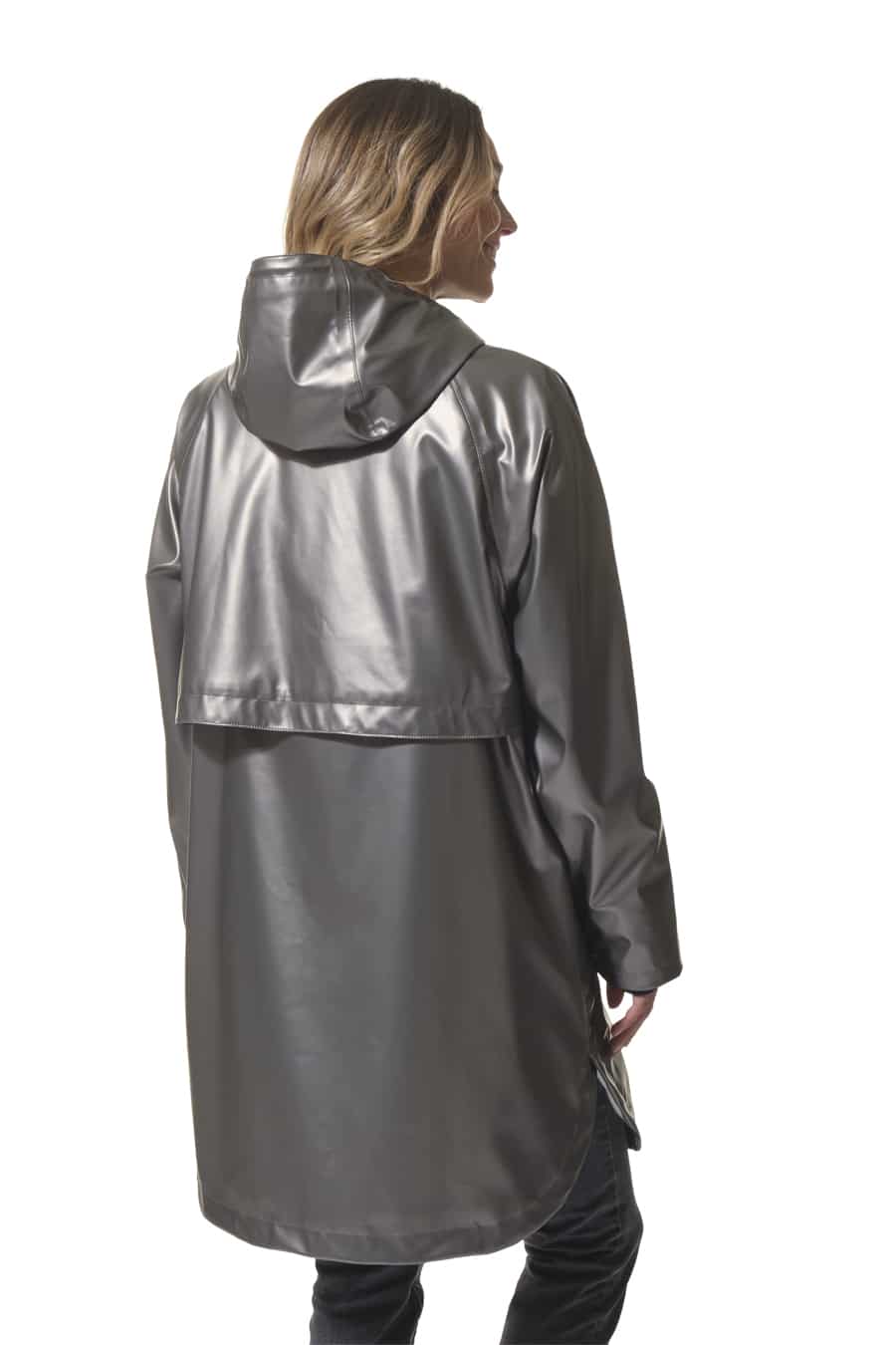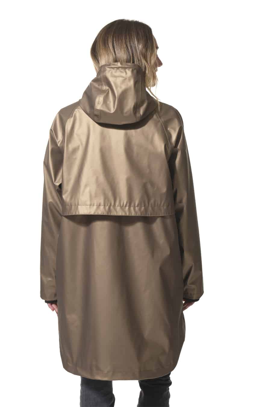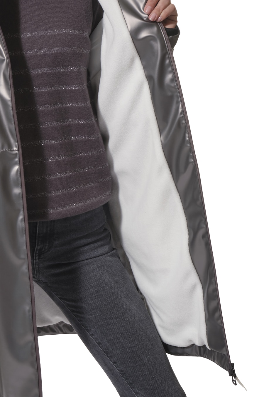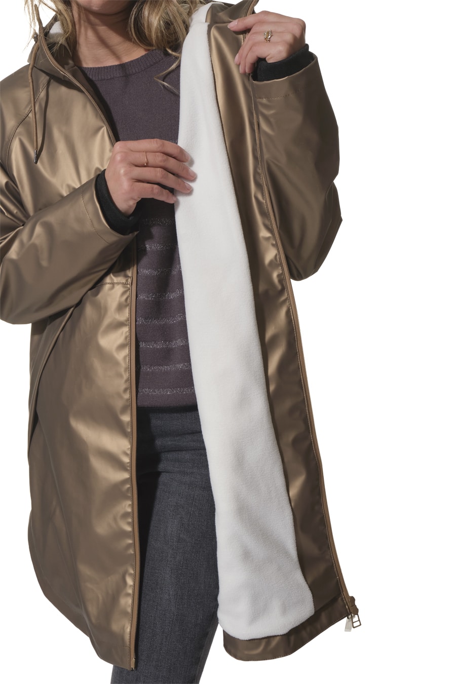 Description: Long raincoat with large pockets, side slits, raglan sleeves and a bib at the back, lined in fleece with non-return sleeves.