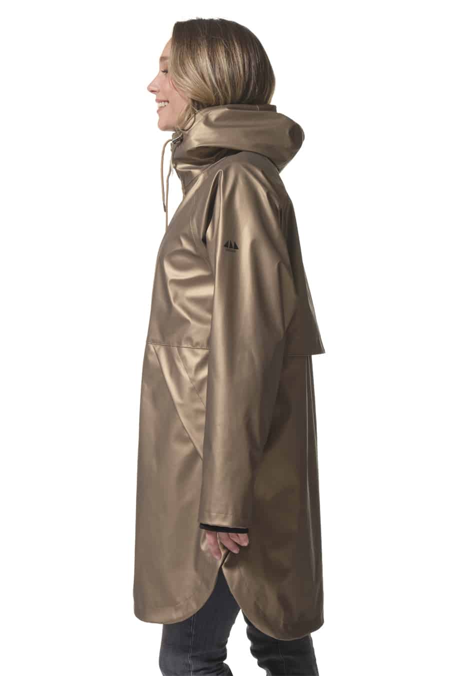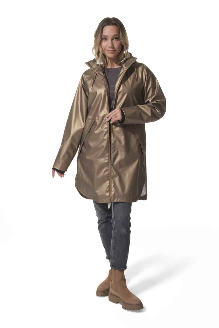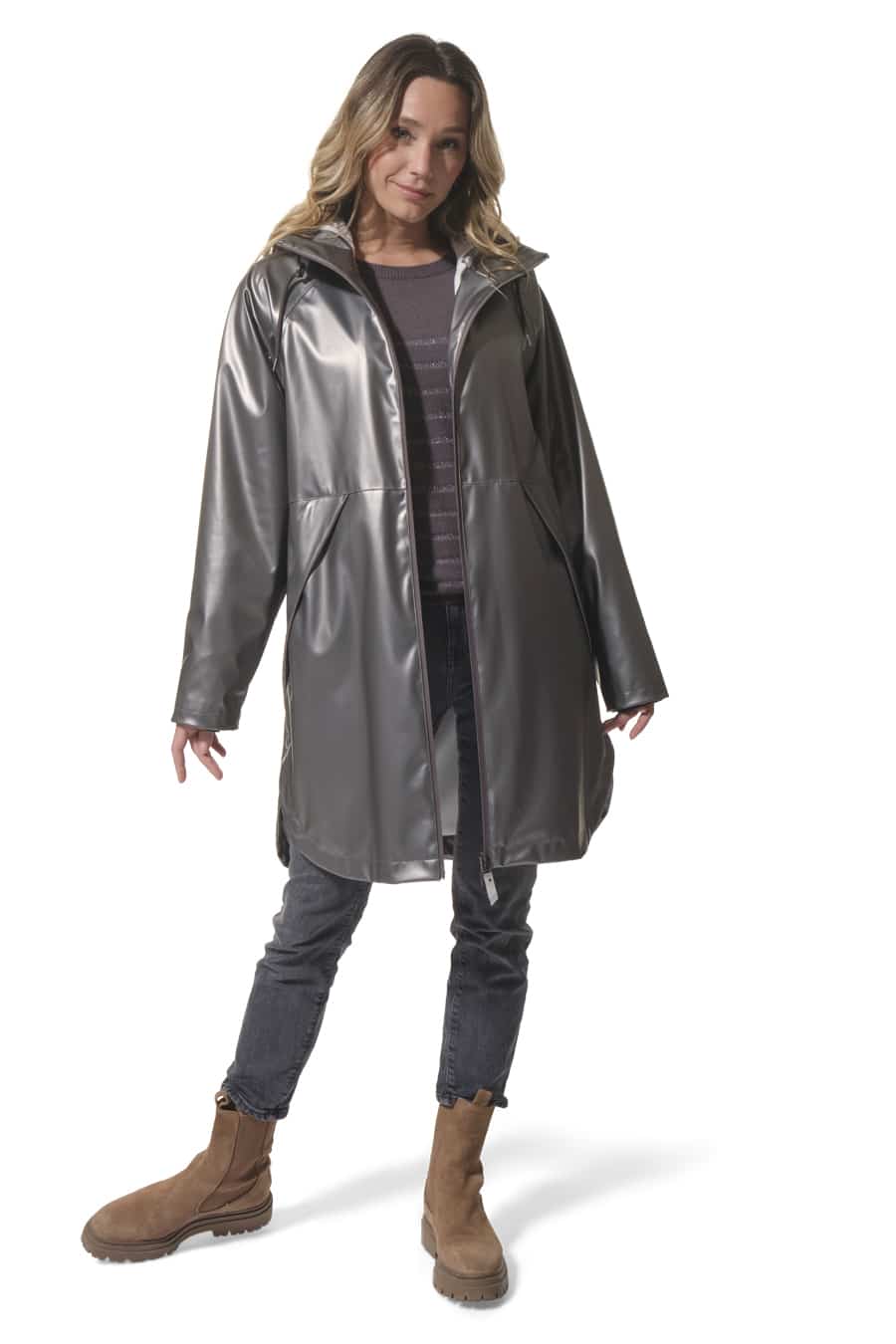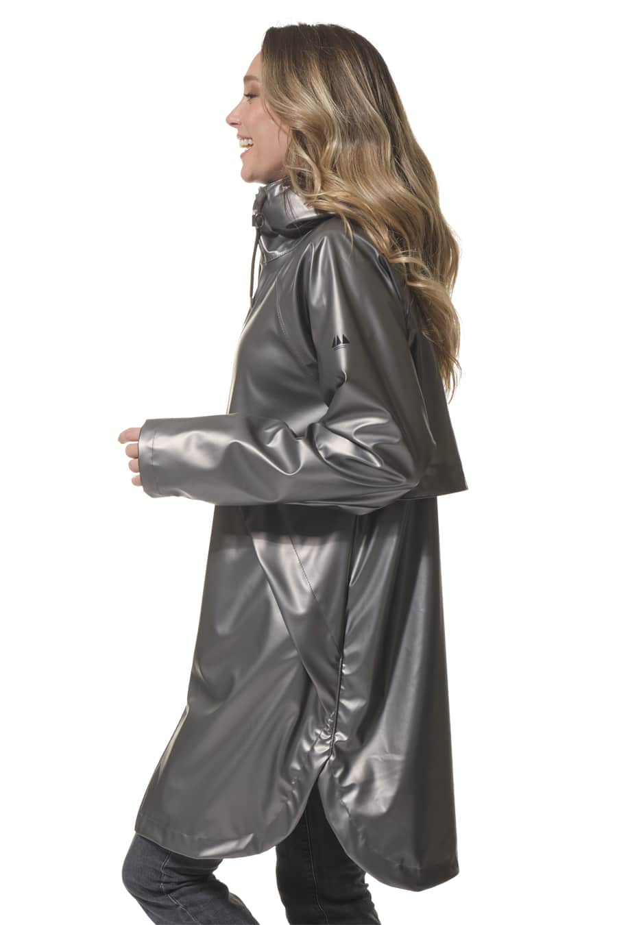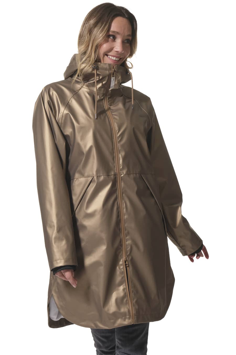 Description: Long raincoat with large pockets, side slits, raglan sleeves and a bib at the back, lined in fleece with non-return sleeves.