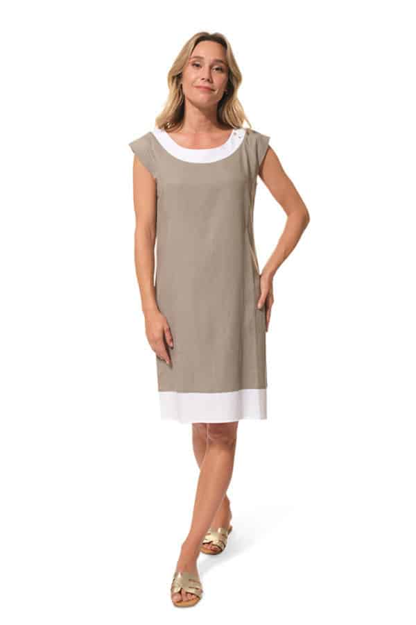 Description: Dress with a small head of sleeves and a wide round neckline.