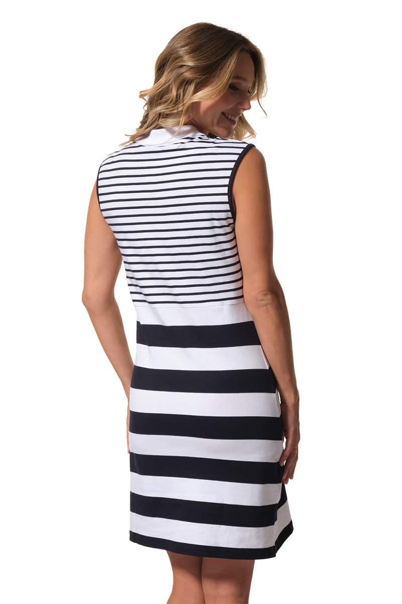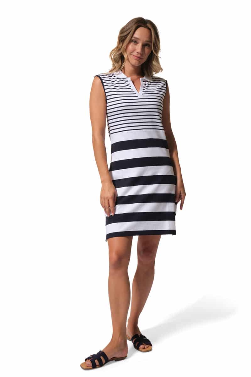 Description : robe sans manches avec une ouverture V et un petit col polo.