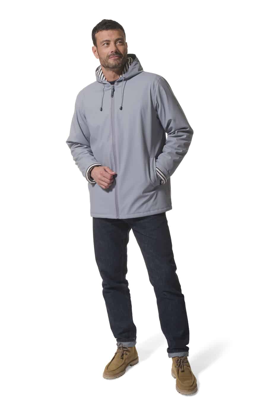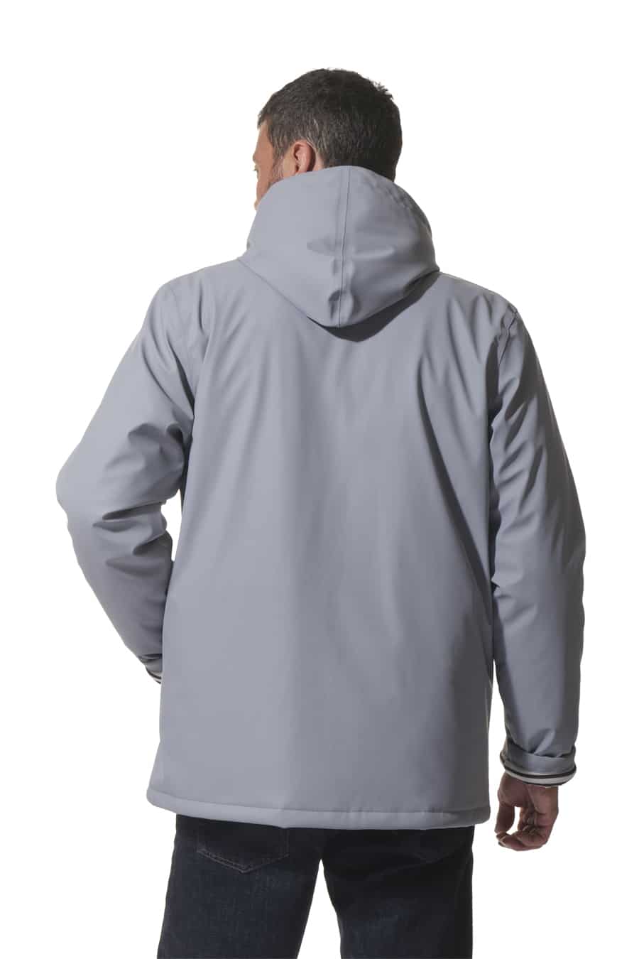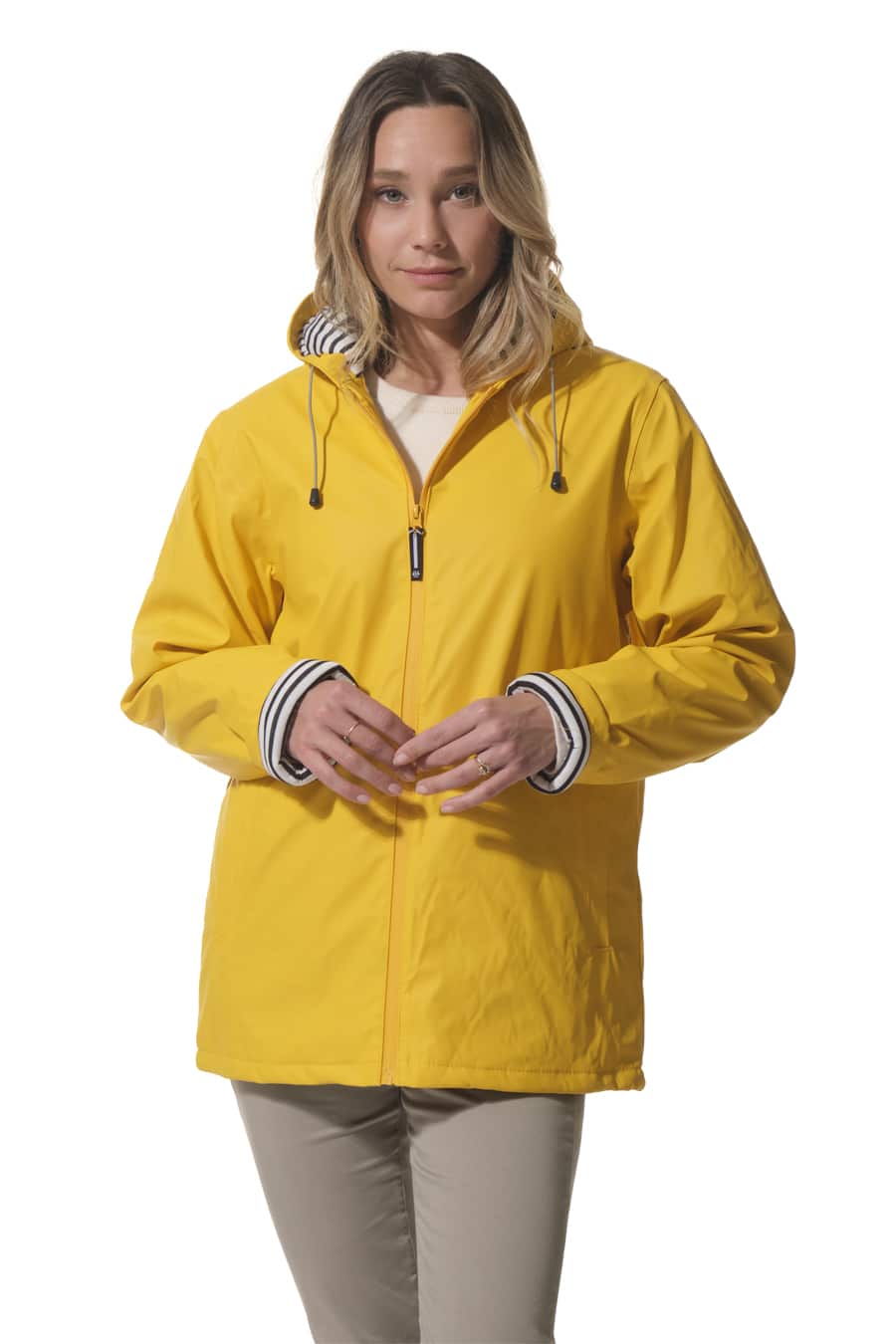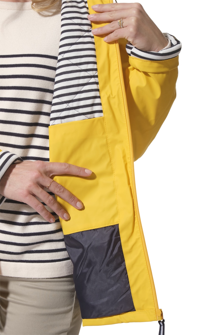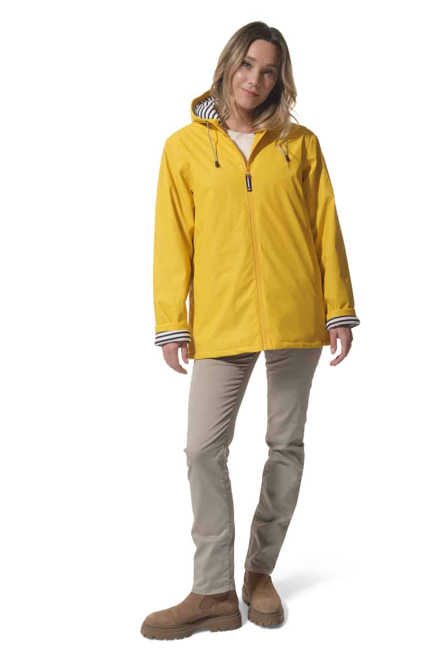 Description: Hooded raincoat with zip fastening and quilted lining.