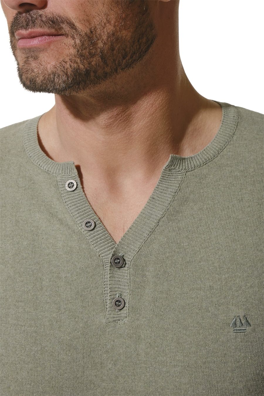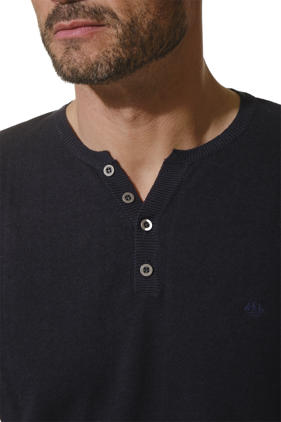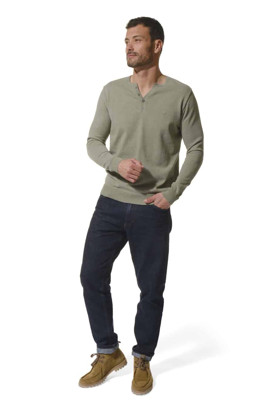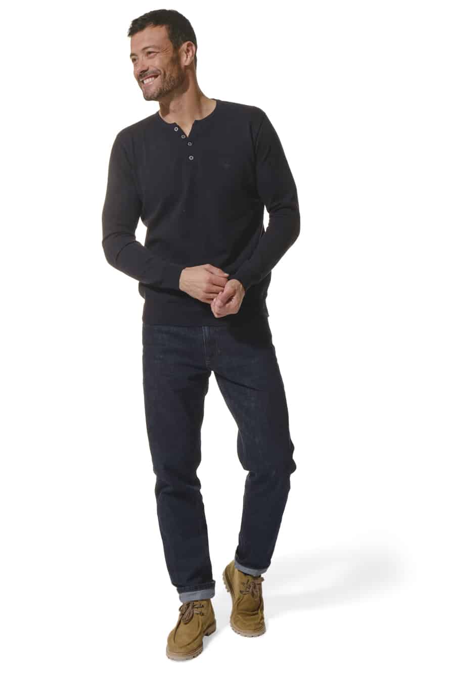 Description: long-sleeved T-shirt with a Tunisian neckline that opens slightly thanks to a button placket.
