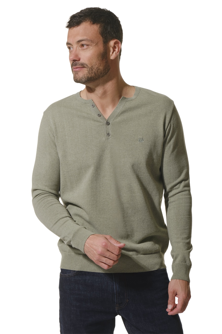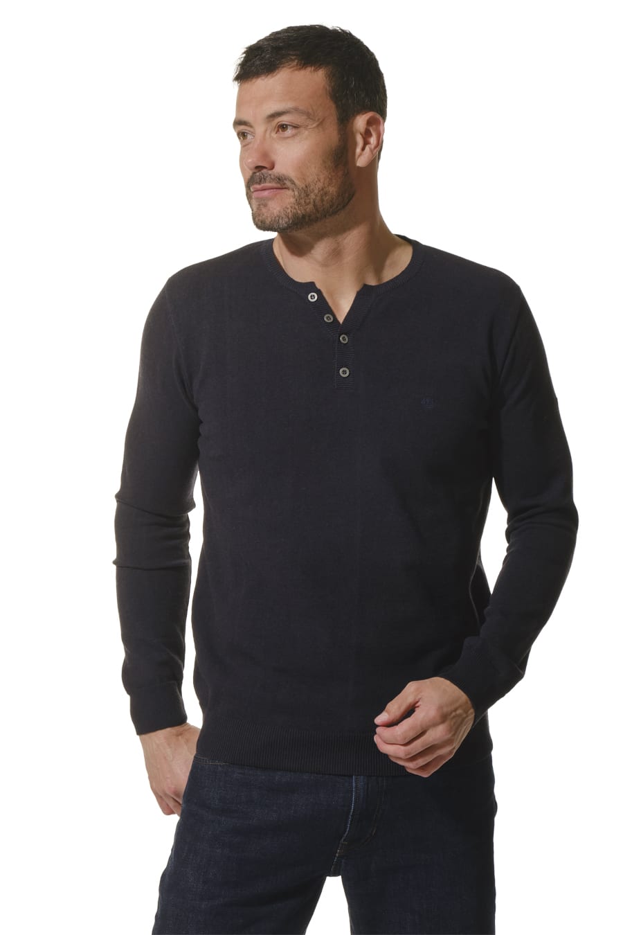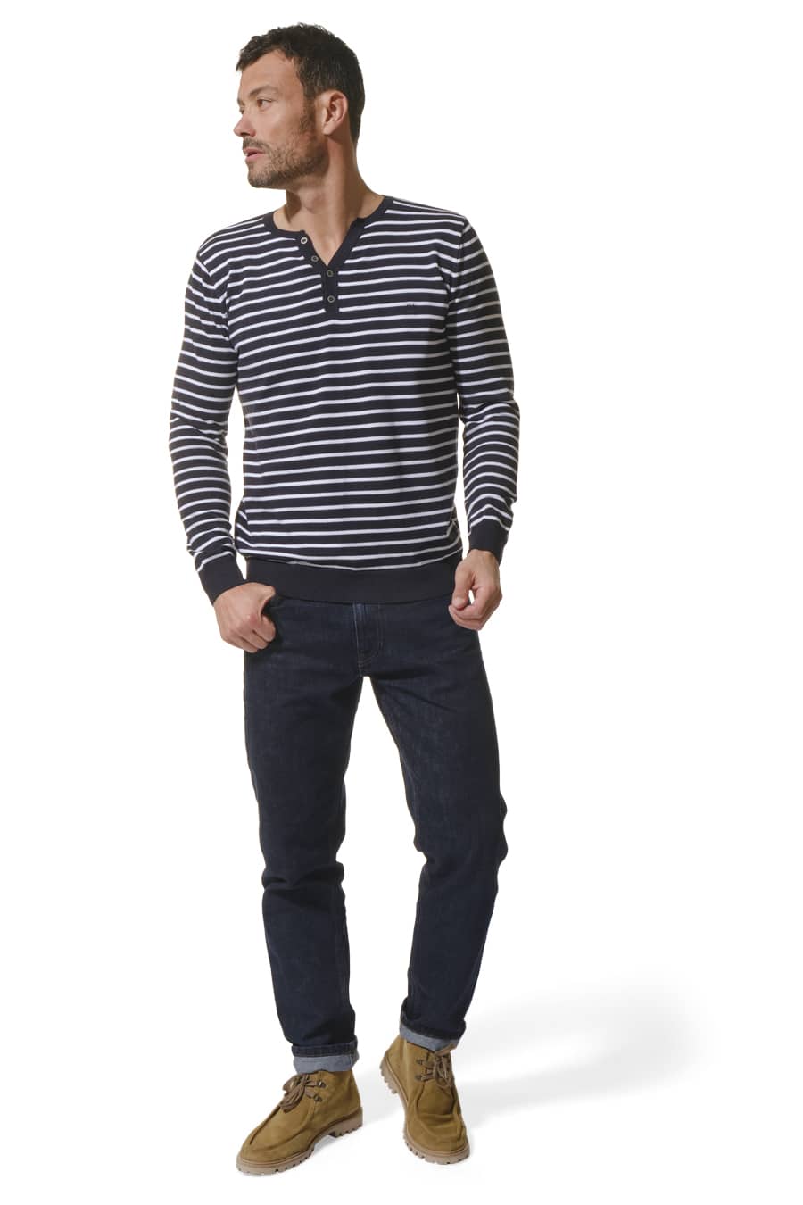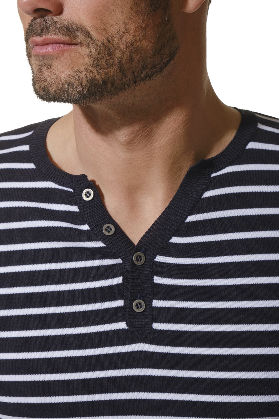 Description: long-sleeved T-shirt with a Tunisian neckline that opens slightly thanks to a button placket.
