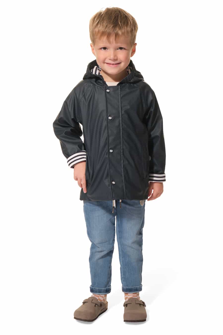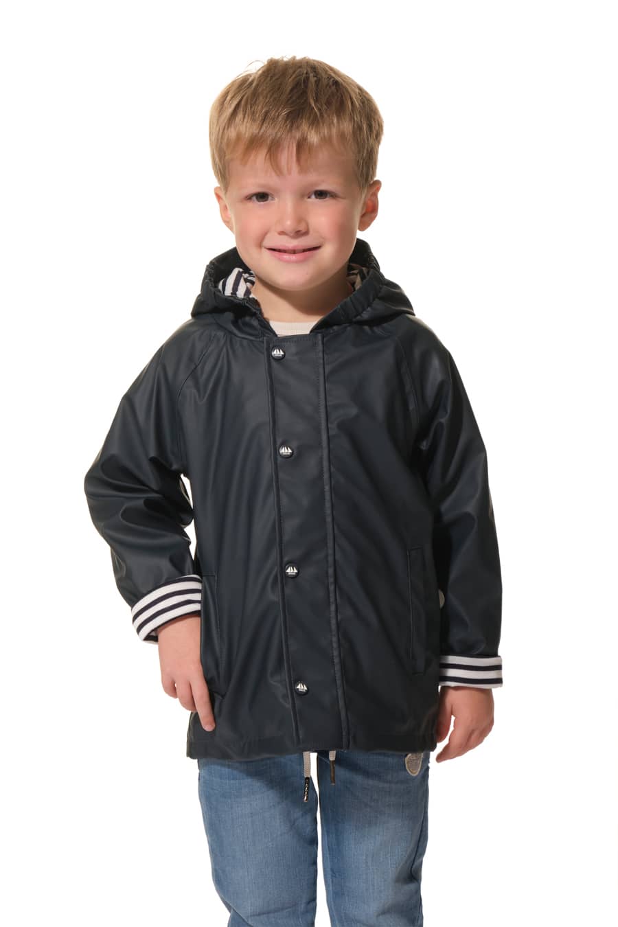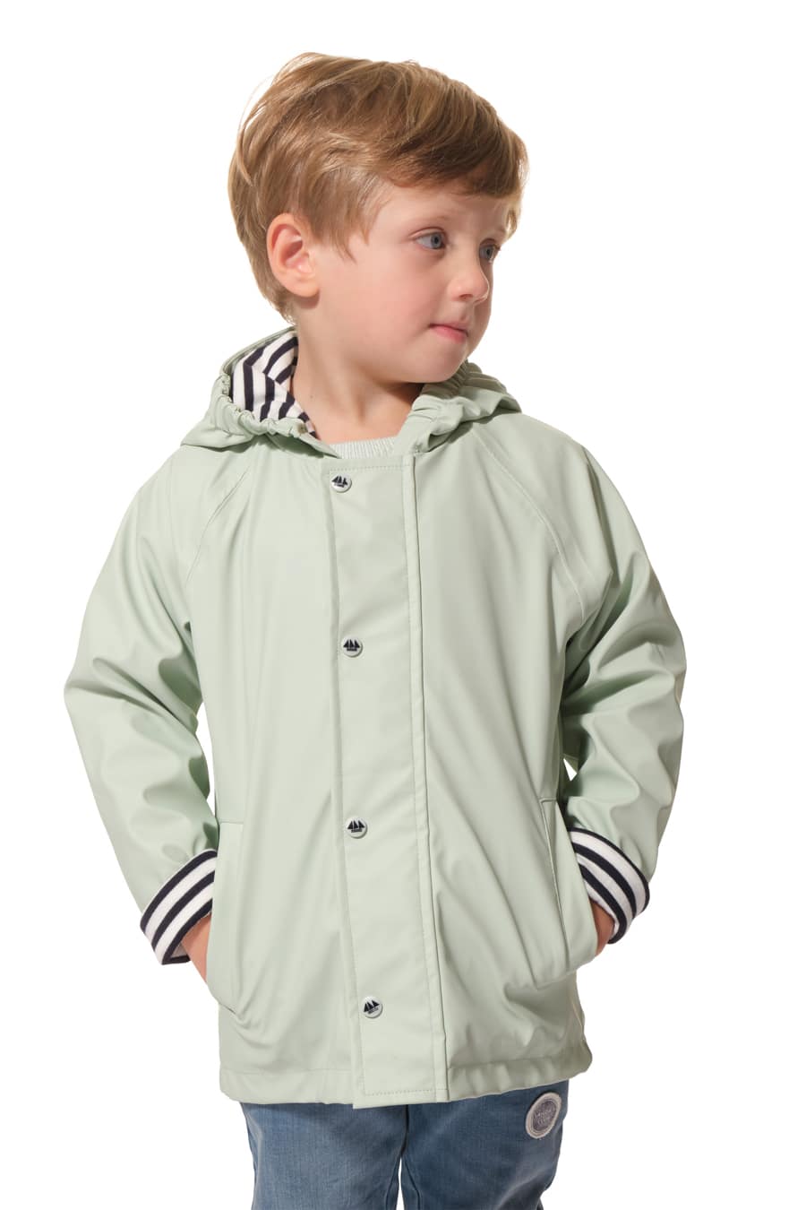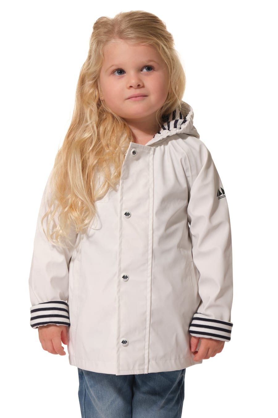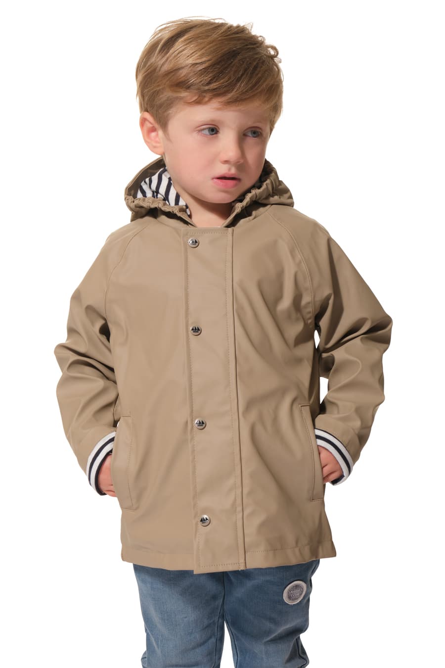 Description: Zip-up raincoat with raglan sleeves and hood, press studs, striped cotton lining.