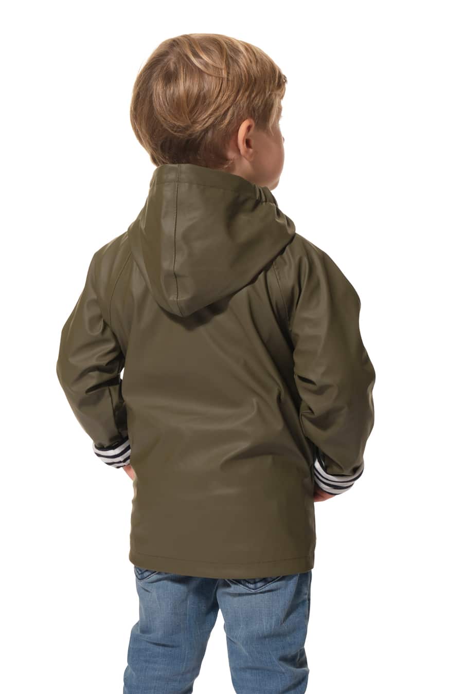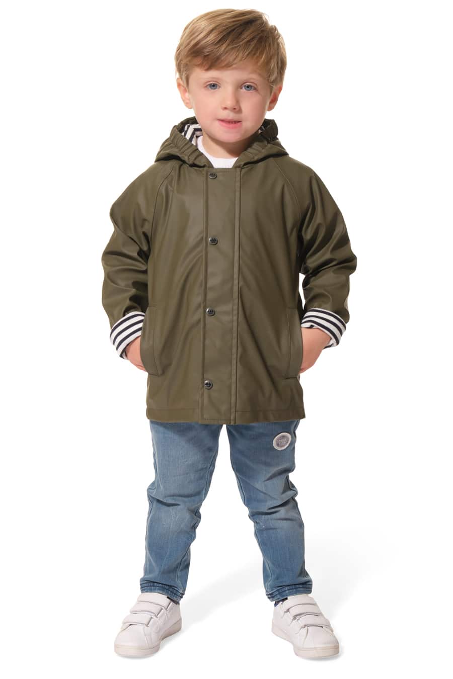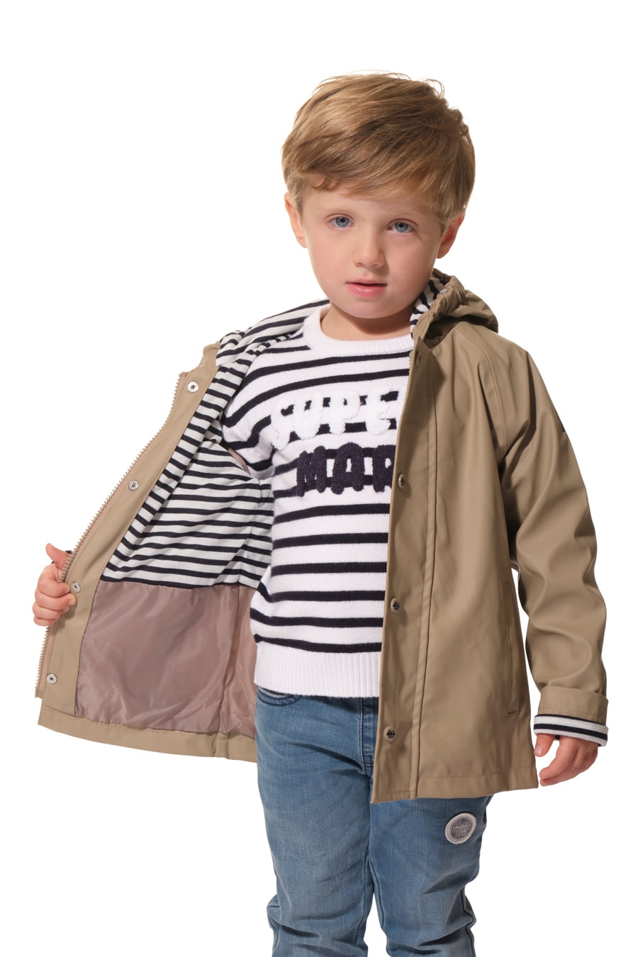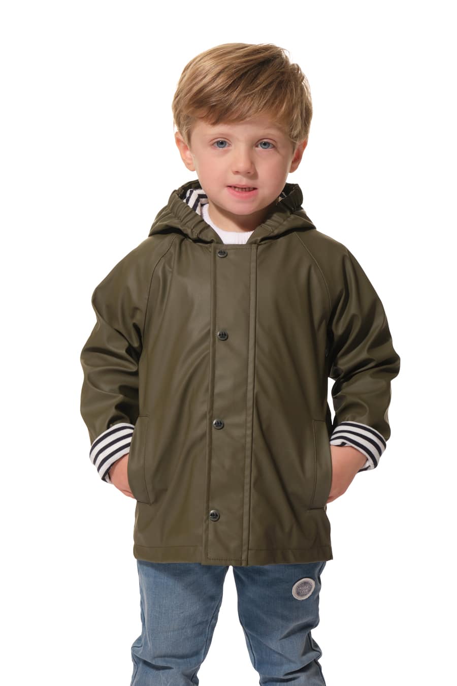 Description: Zip-up raincoat with raglan sleeves and hood, press studs, striped cotton lining.