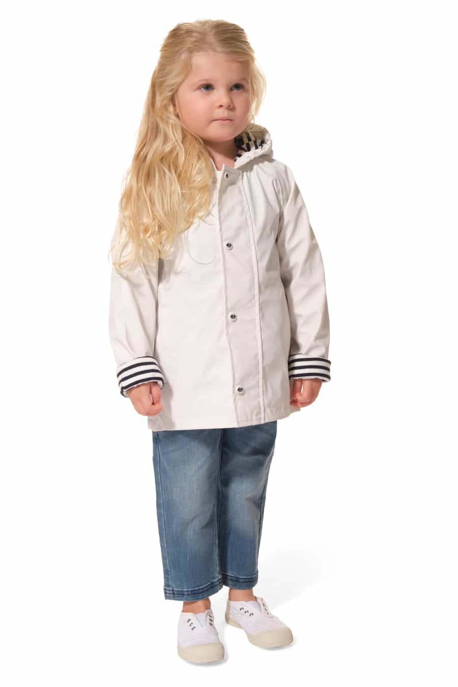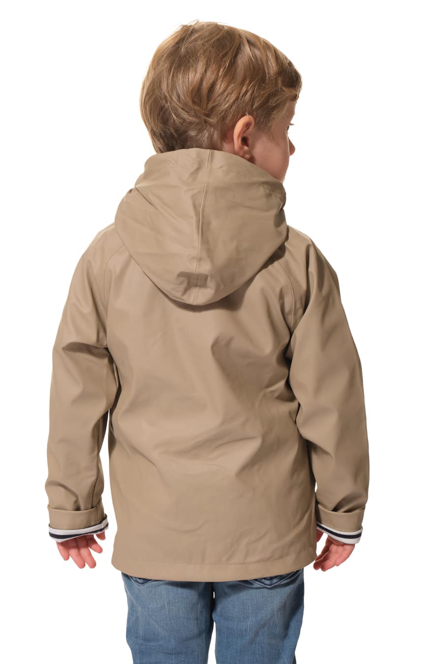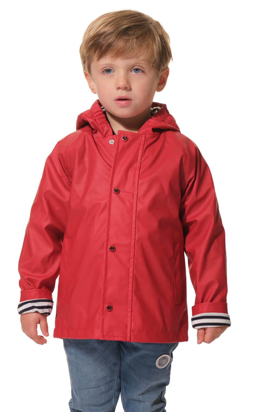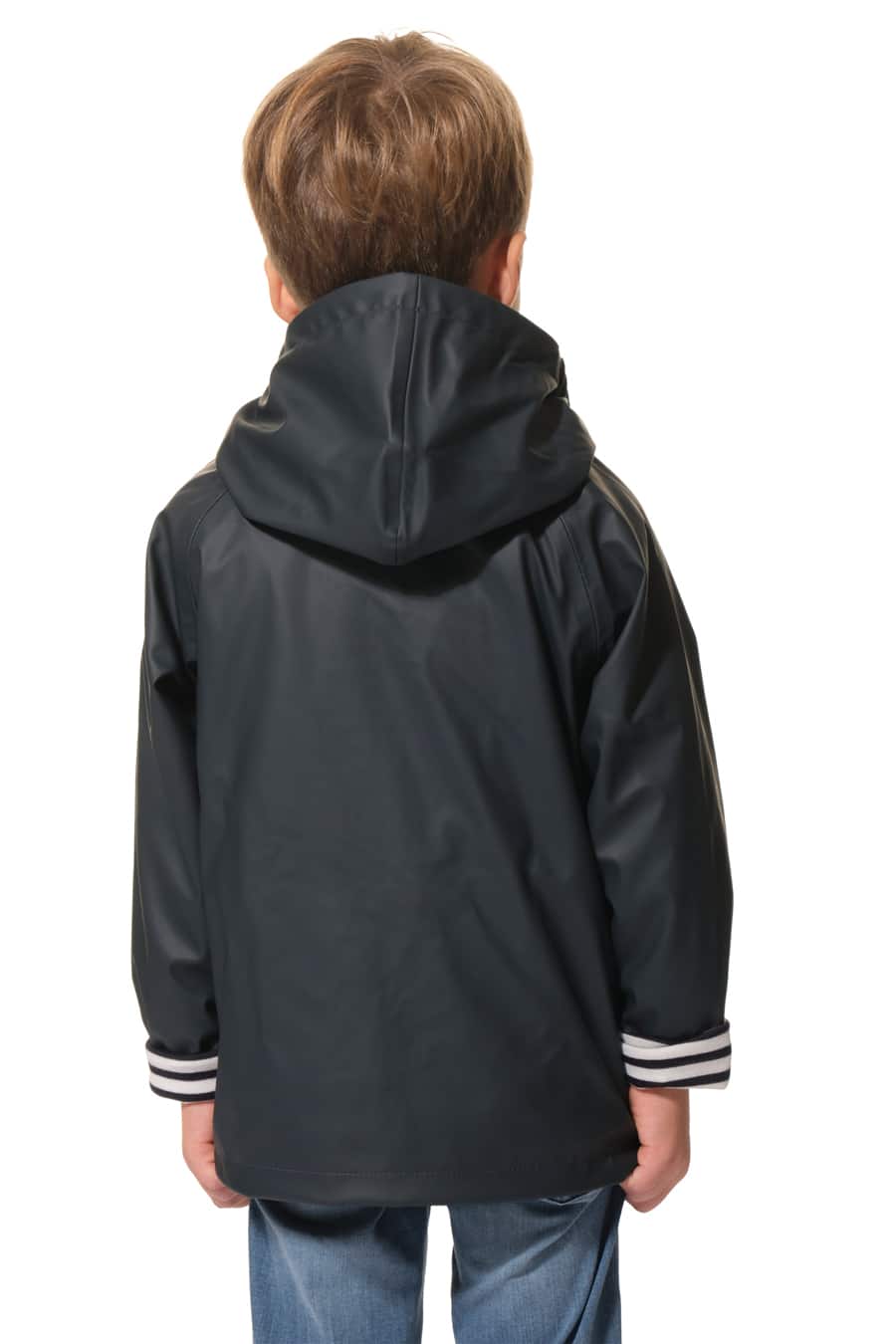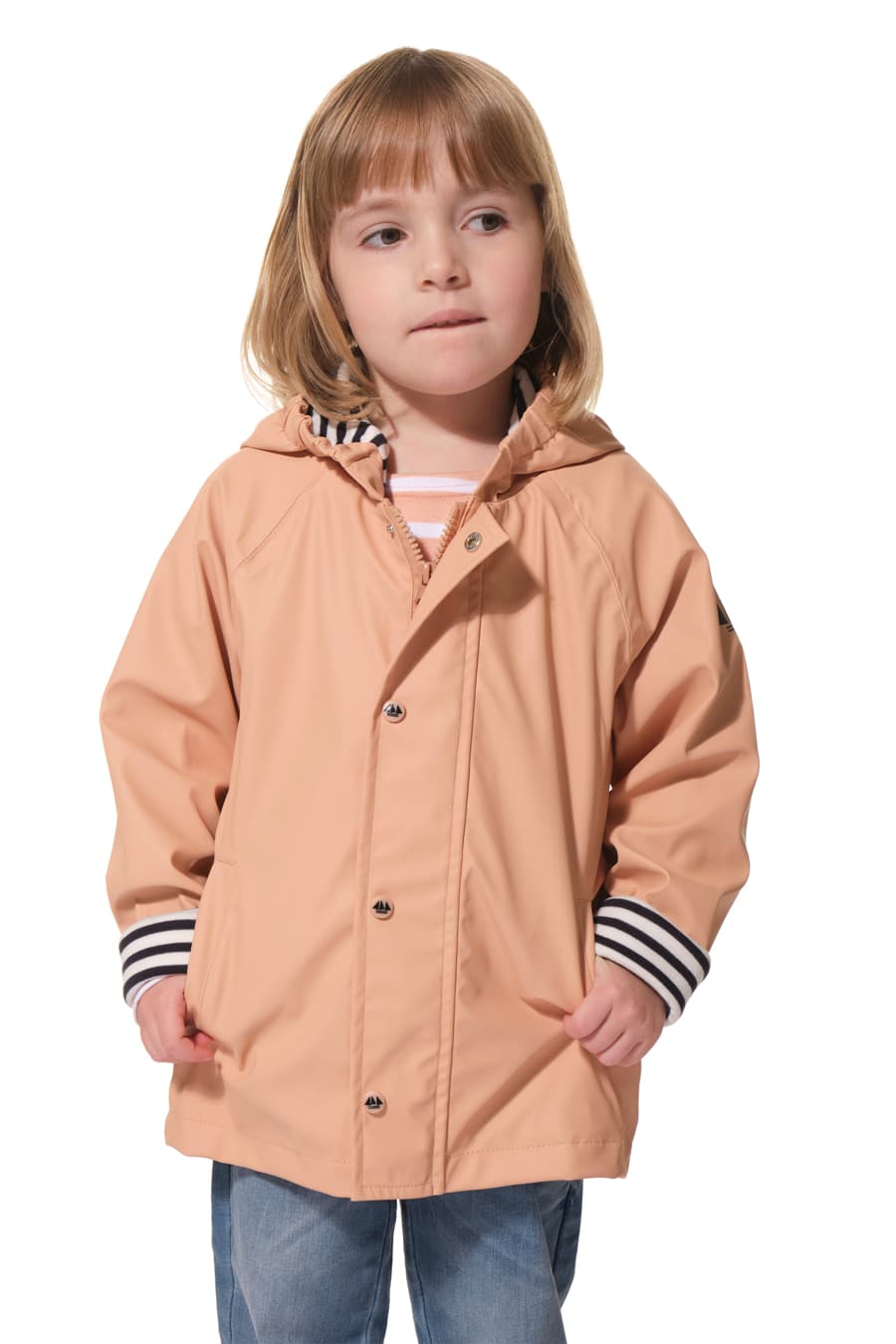 Description: Zip-up raincoat with raglan sleeves and hood, press studs, striped cotton lining.