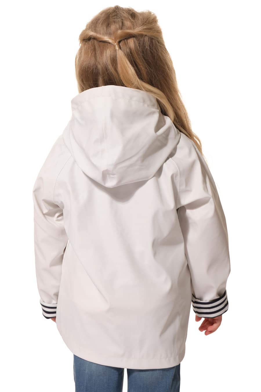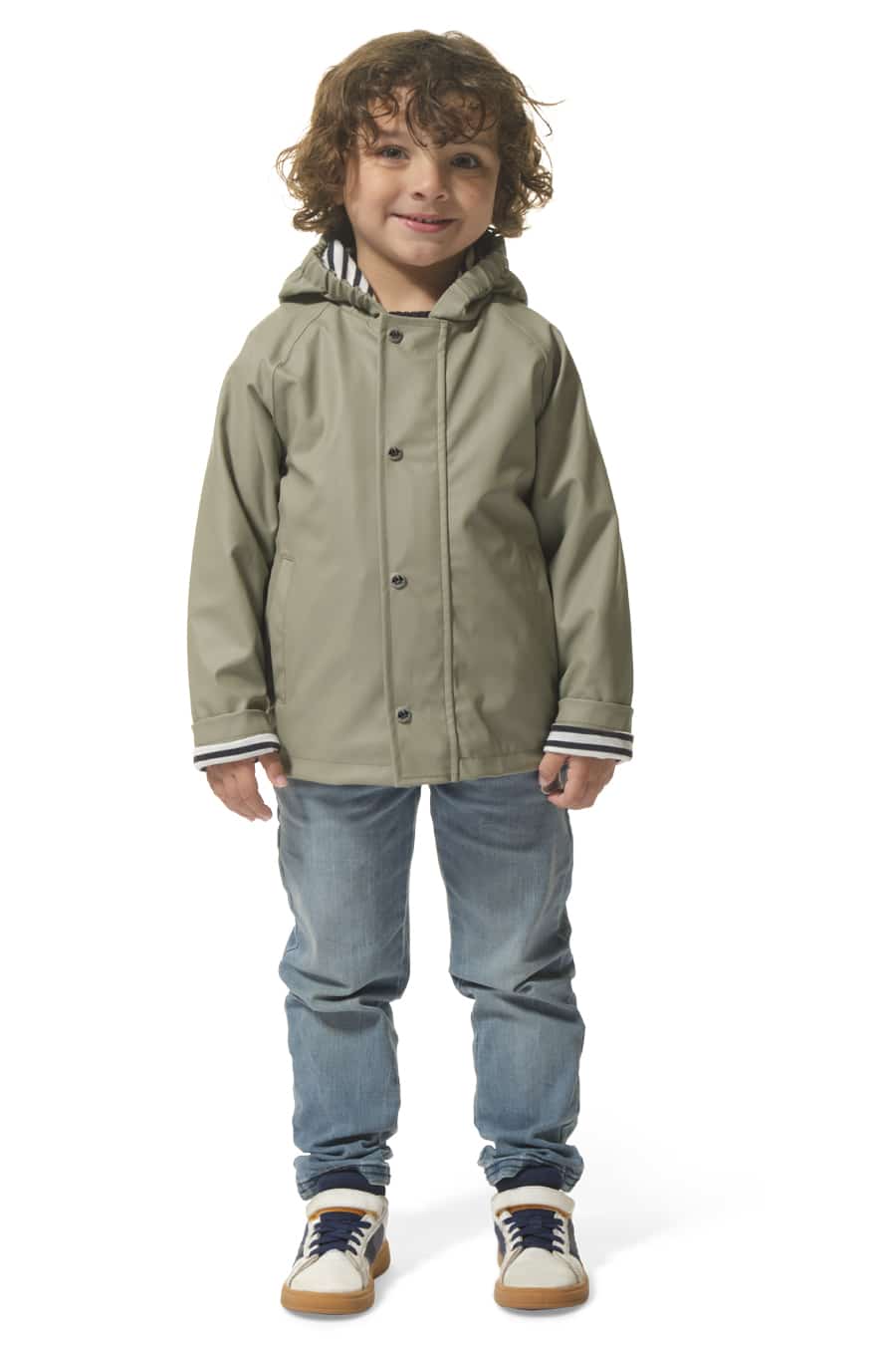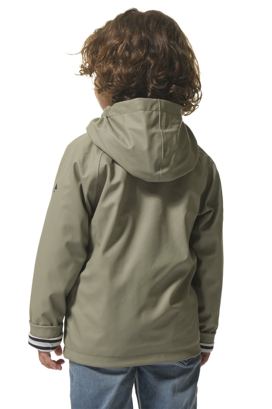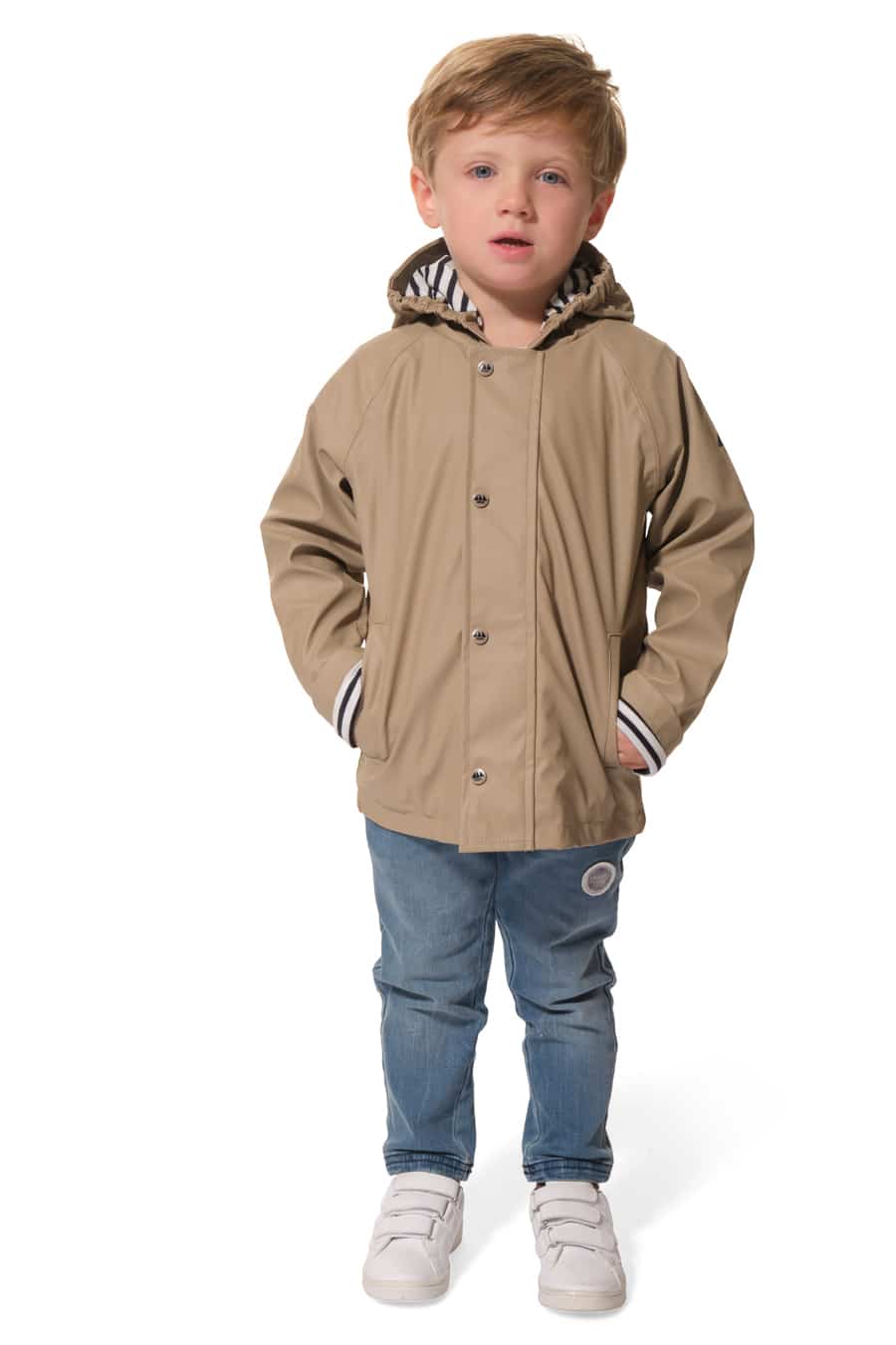 Description: Zip-up raincoat with raglan sleeves and hood, press studs, striped cotton lining.