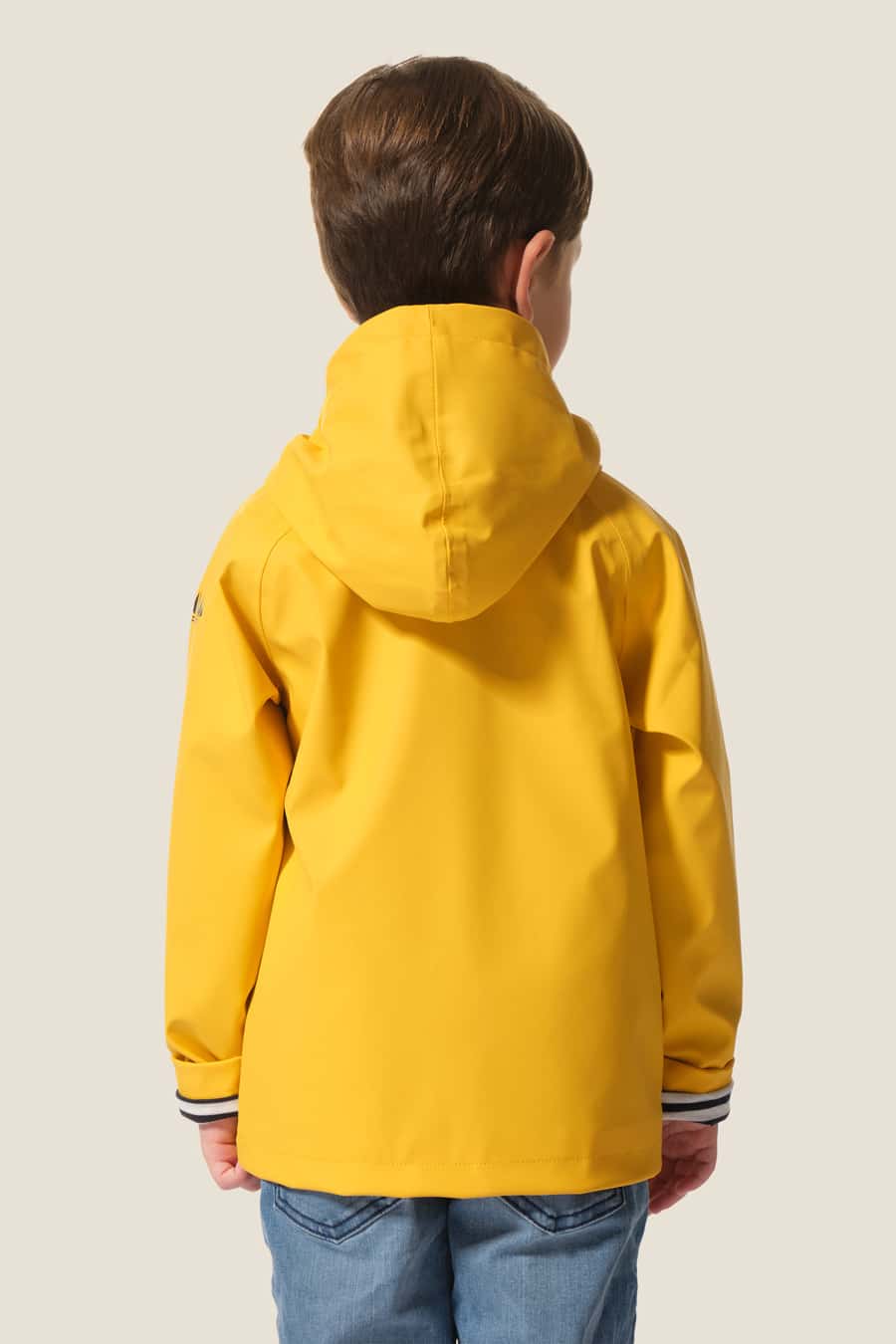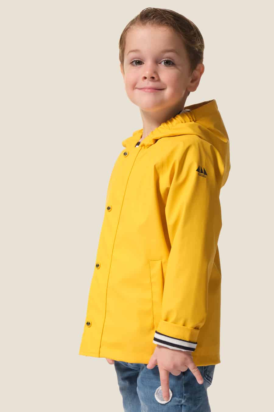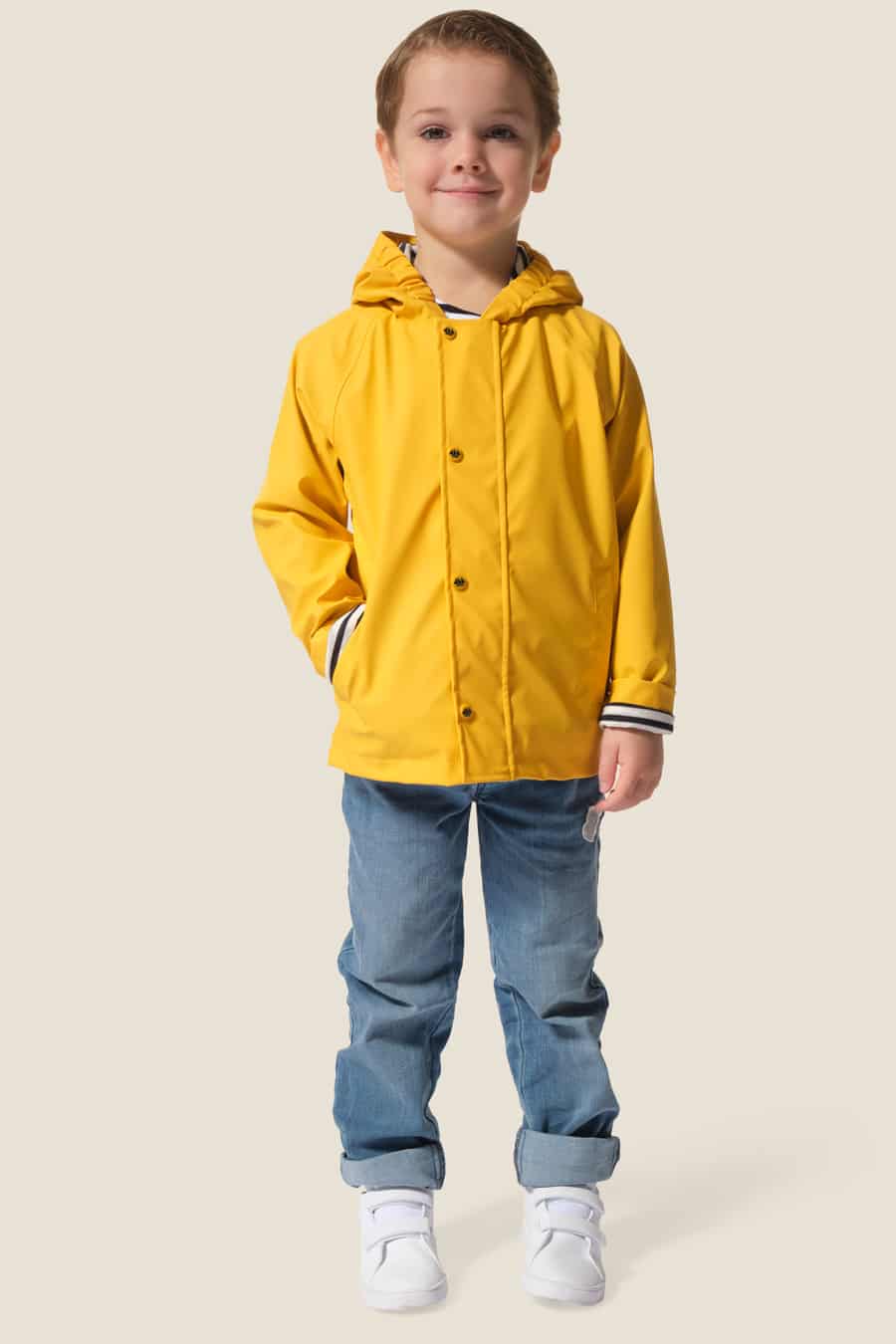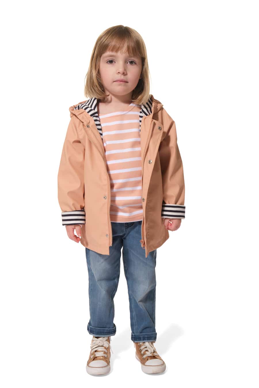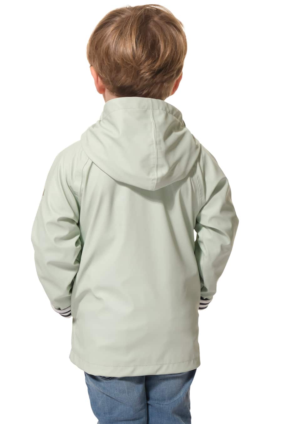 Description: Zip-up raincoat with raglan sleeves and hood, press studs, striped cotton lining.