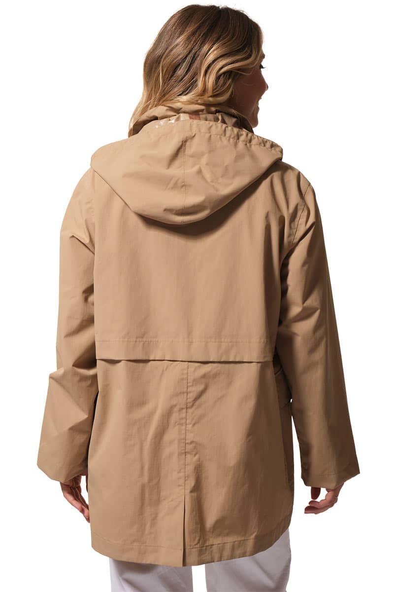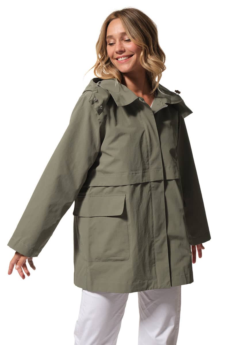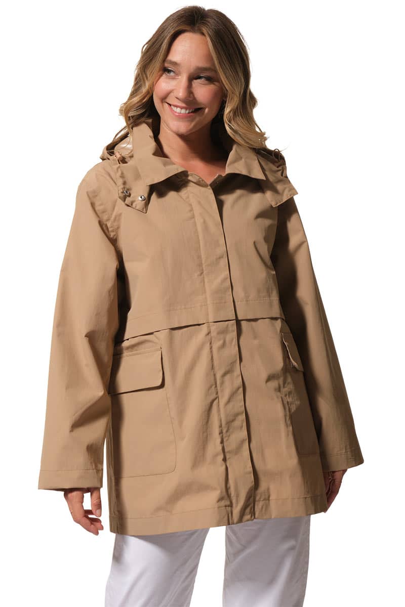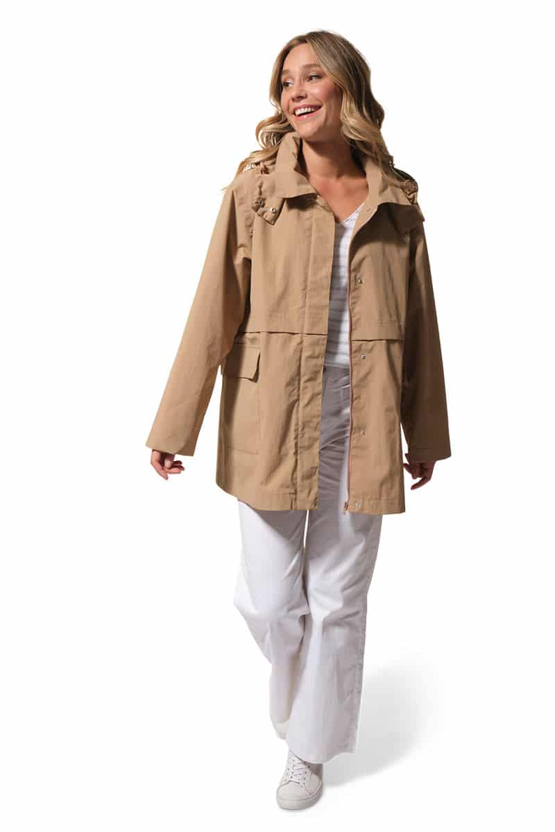 Description : Ciré coupe-vent avec fermeture par zip et une capuche ajustable;