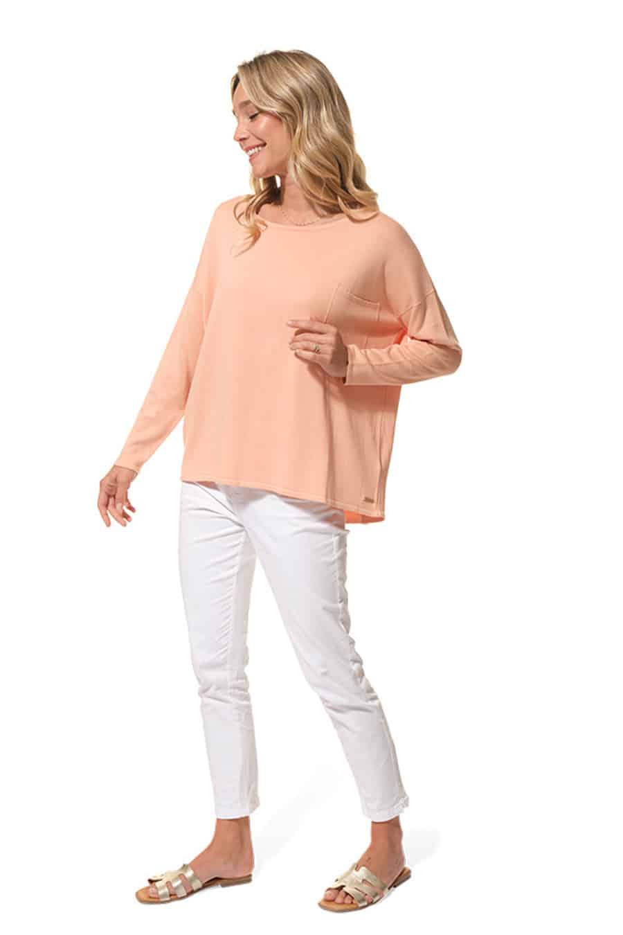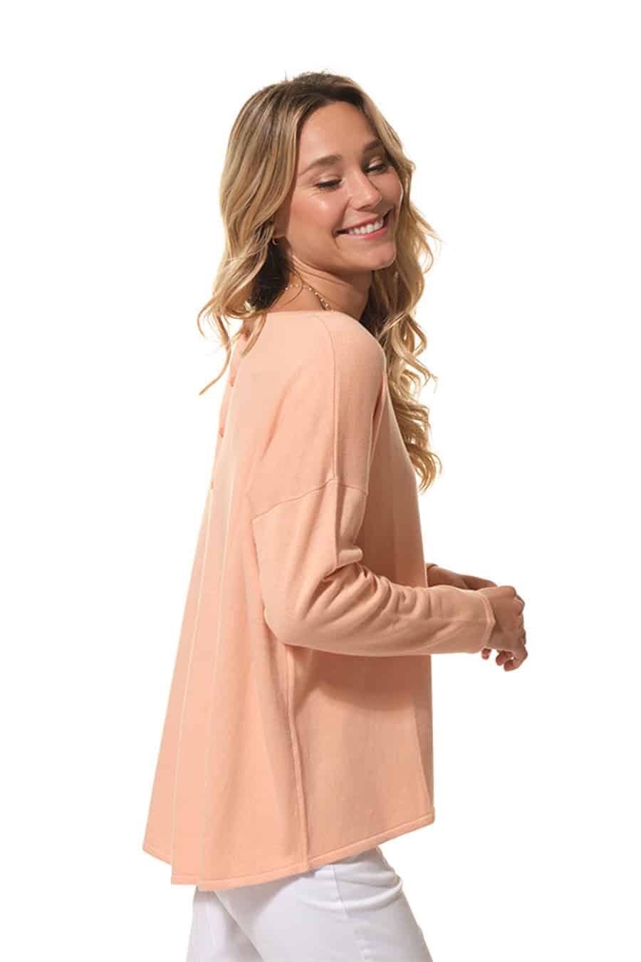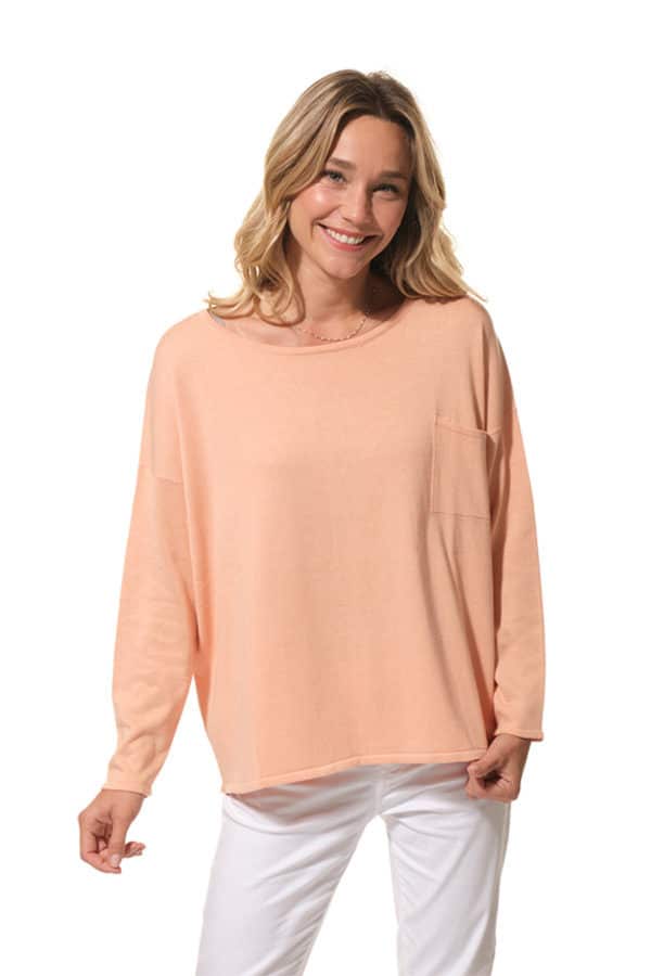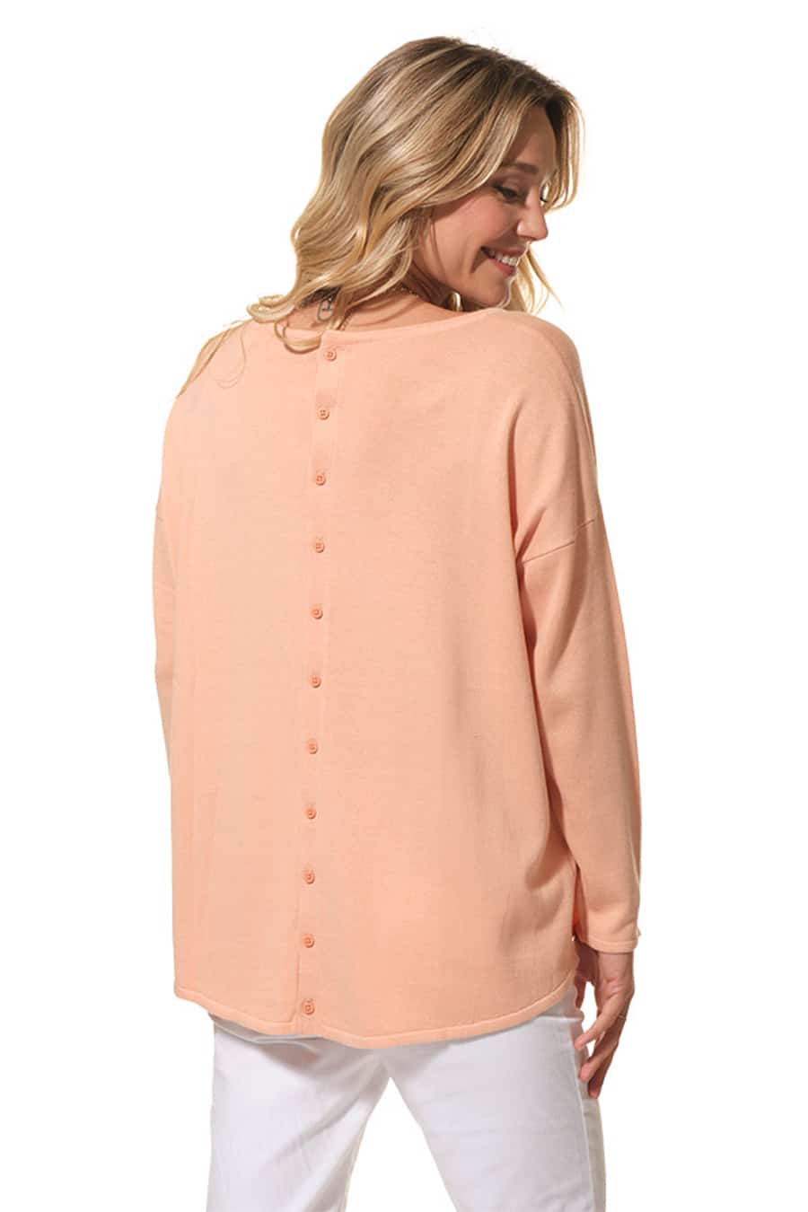 Description: Oversized round-neck jumper with a chest pocket and button fastening at the back.
