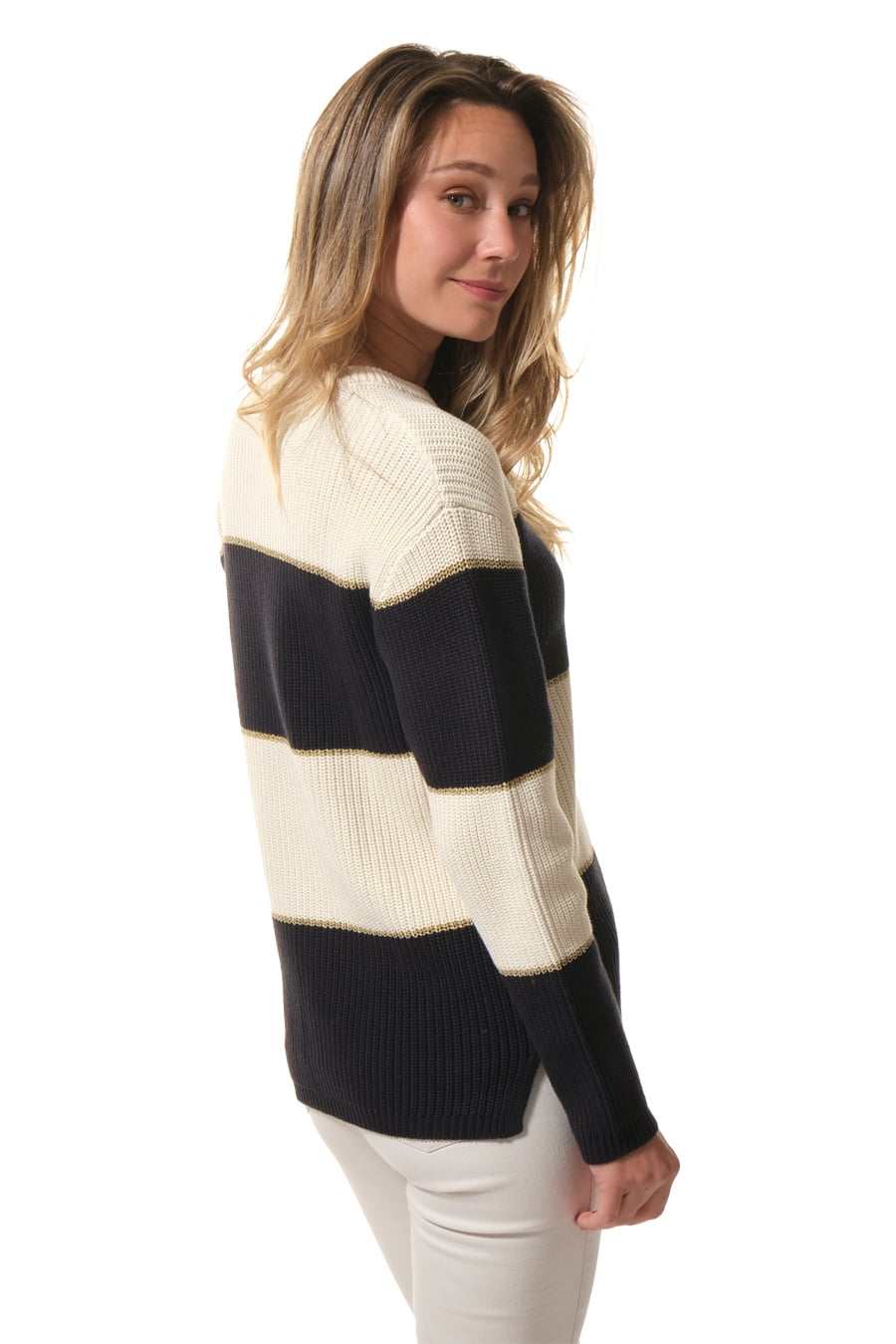 Description: Round-neck jumper with stripes edged with gold metallic thread.