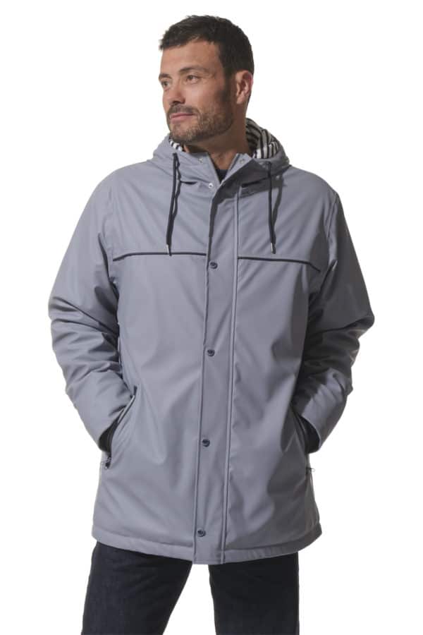 Description : Ciré marin étanche doublé en polaire avec capuche, une fermeture par zip et par pressions et des manchons anti-retour.