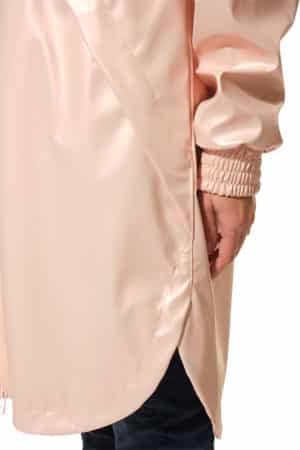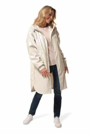 Description : Ciré long avec des grandes poches, une doublure filet, des manches raglans et un bavolet dans le dos.