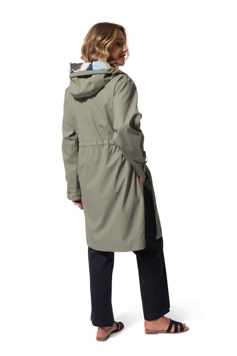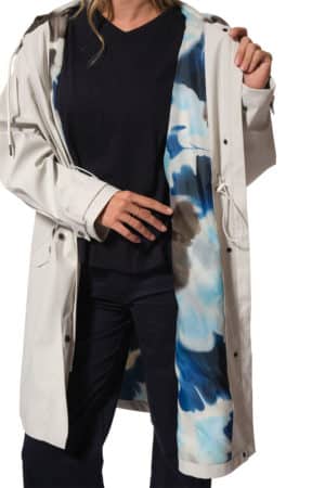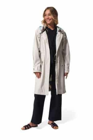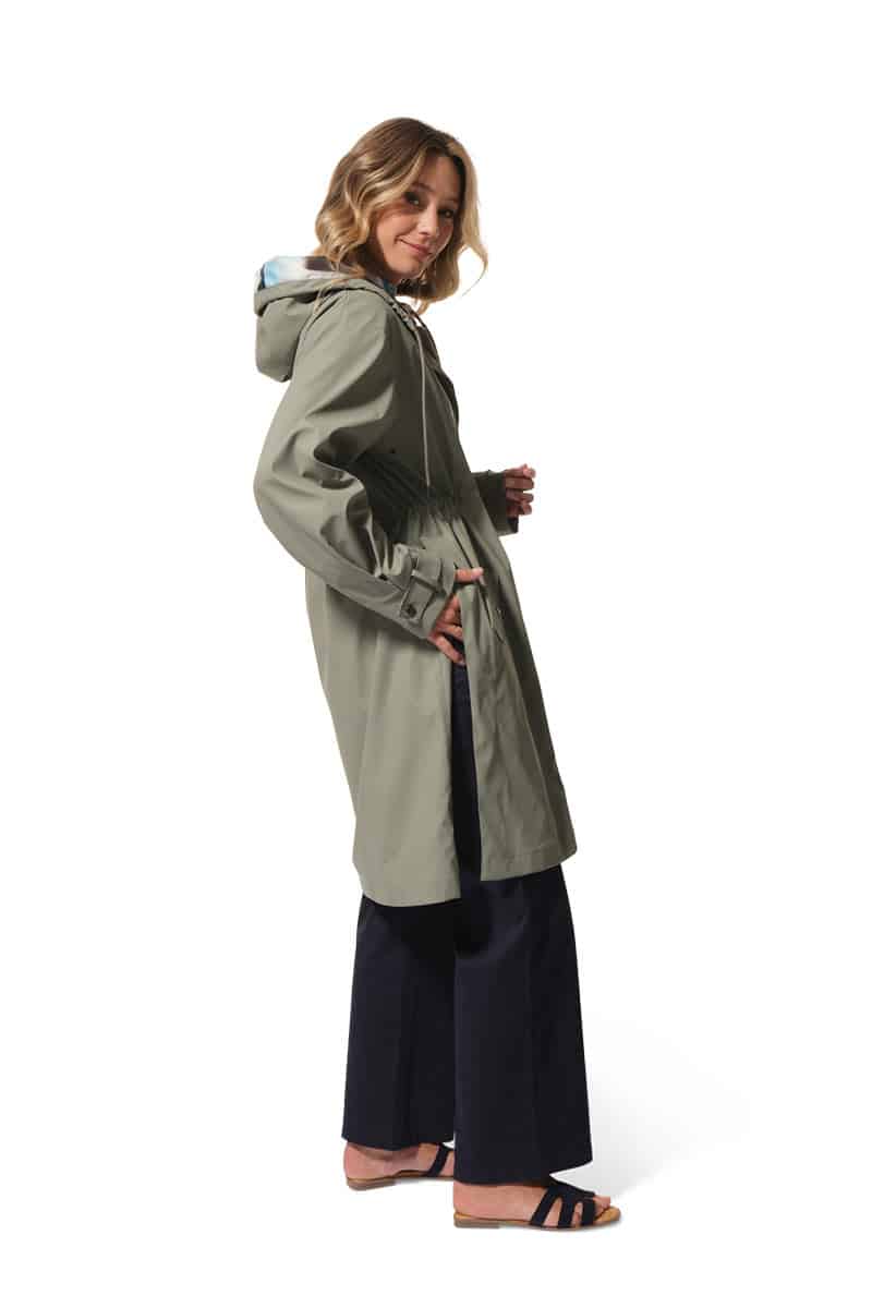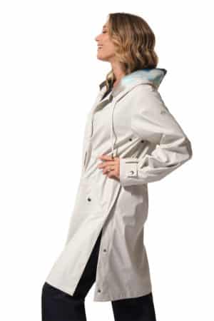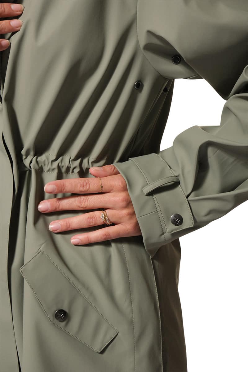 Description : ciré long avec une fermeture par zip doublé d’une patte de boutonnage à boutons pressions. Un lien de serrage cintre la taille. Les fentes sur les côtés permettent une grande mobilité et s’adaptent grâce aux boutons pressionnés. Un grand bavolet orne le dos.