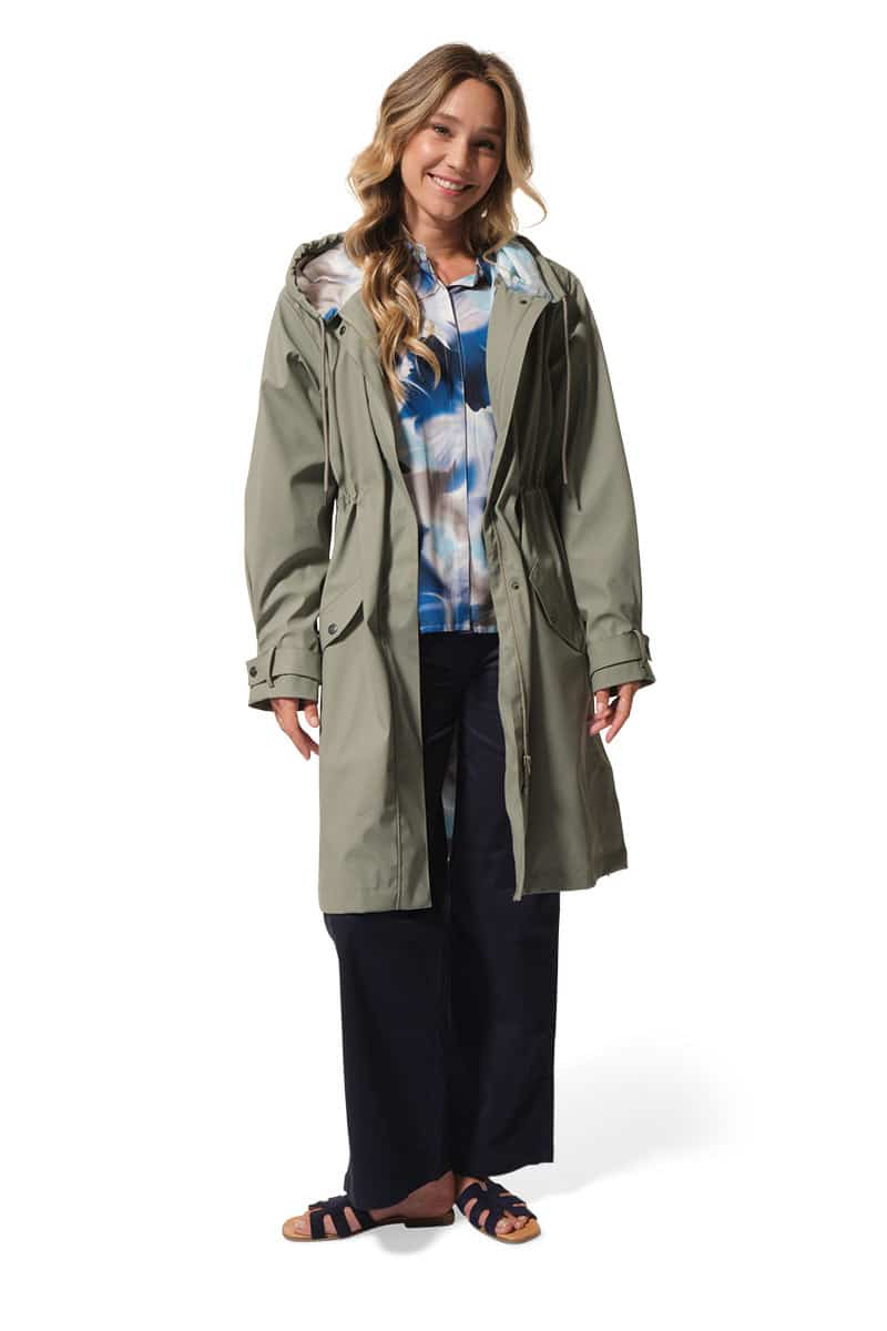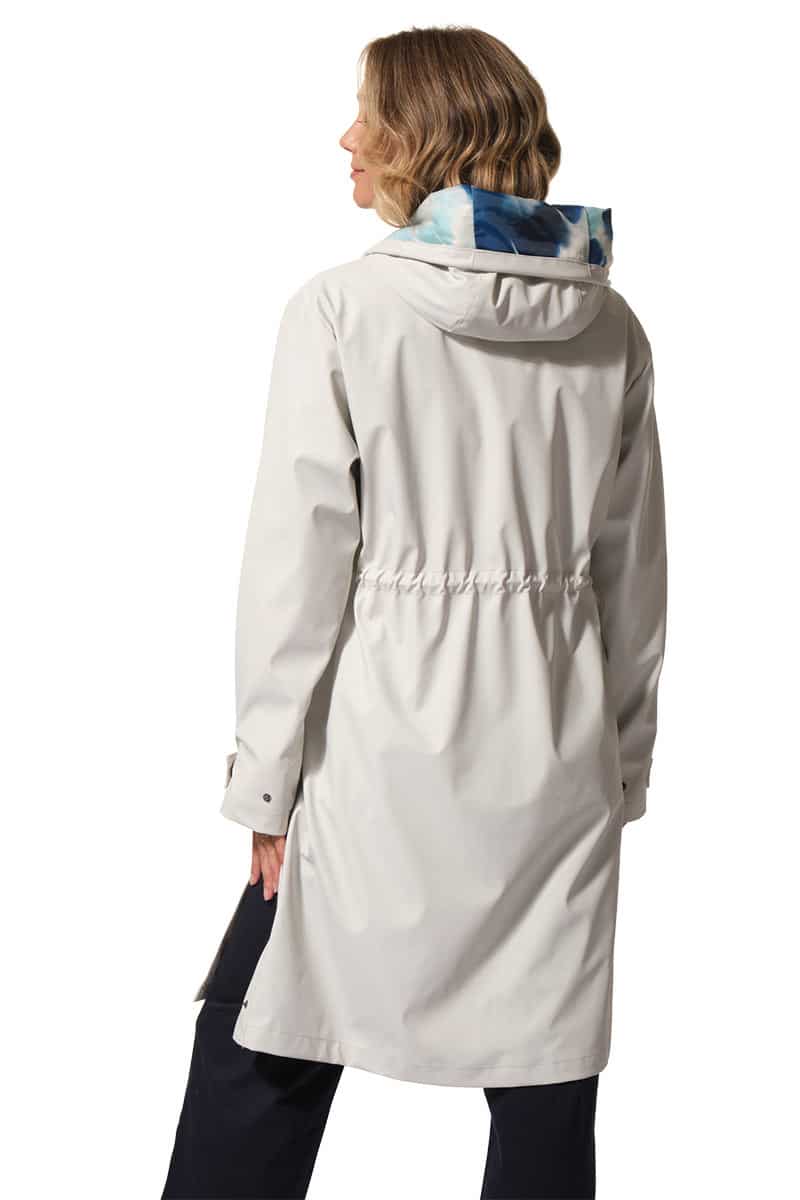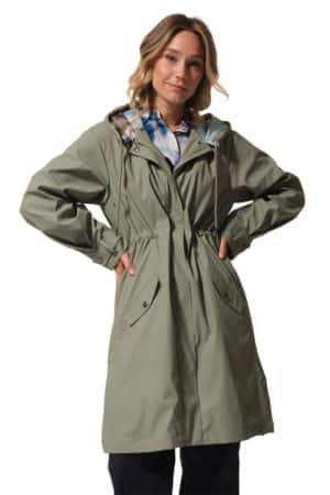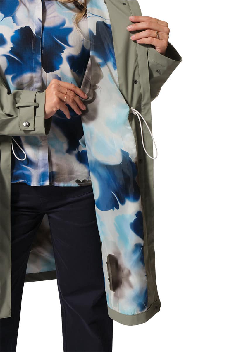 Description : ciré long avec une fermeture par zip doublé d’une patte de boutonnage à boutons pressions. Un lien de serrage cintre la taille. Les fentes sur les côtés permettent une grande mobilité et s’adaptent grâce aux boutons pressionnés. Un grand bavolet orne le dos.