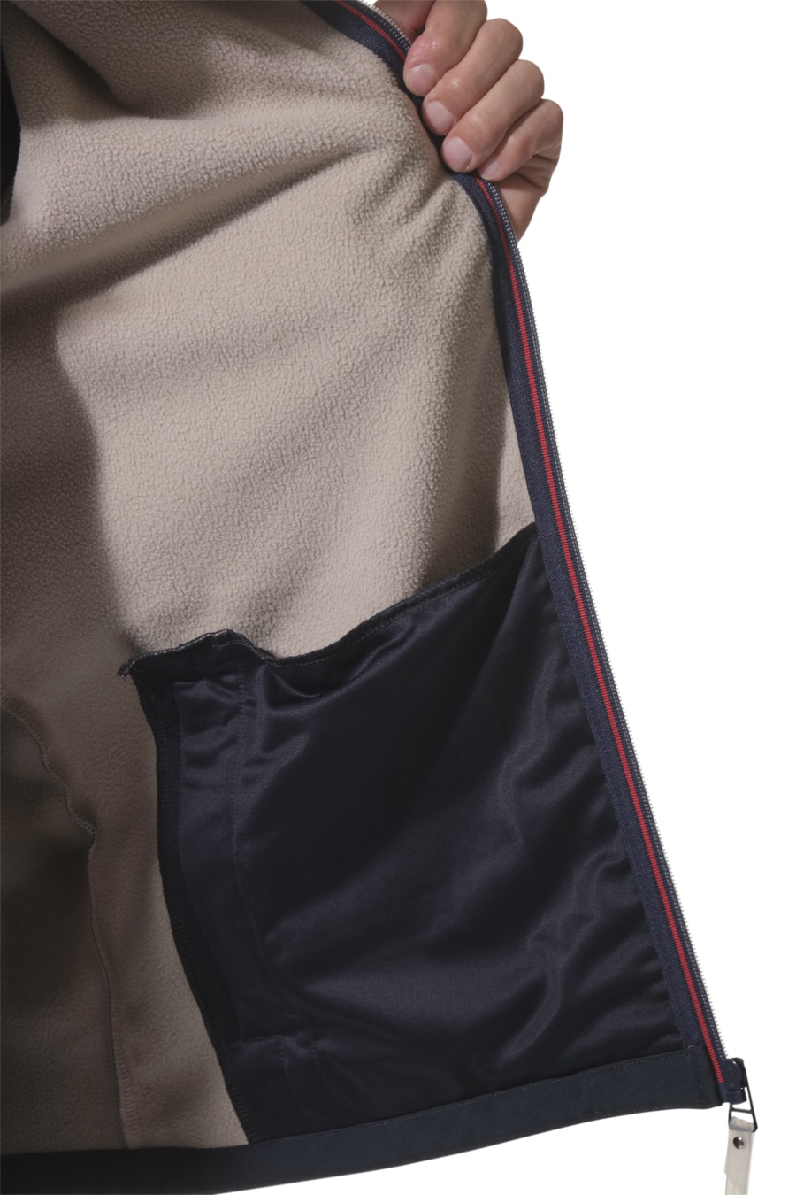Description : Blouson zippé avec capuche amovible en matière contre-collé polaire et softshell déperlant et respirant.
