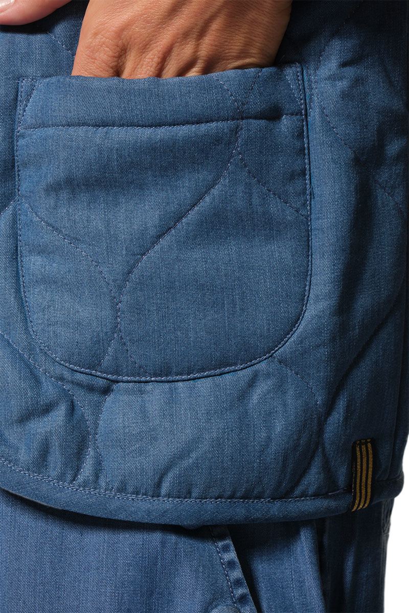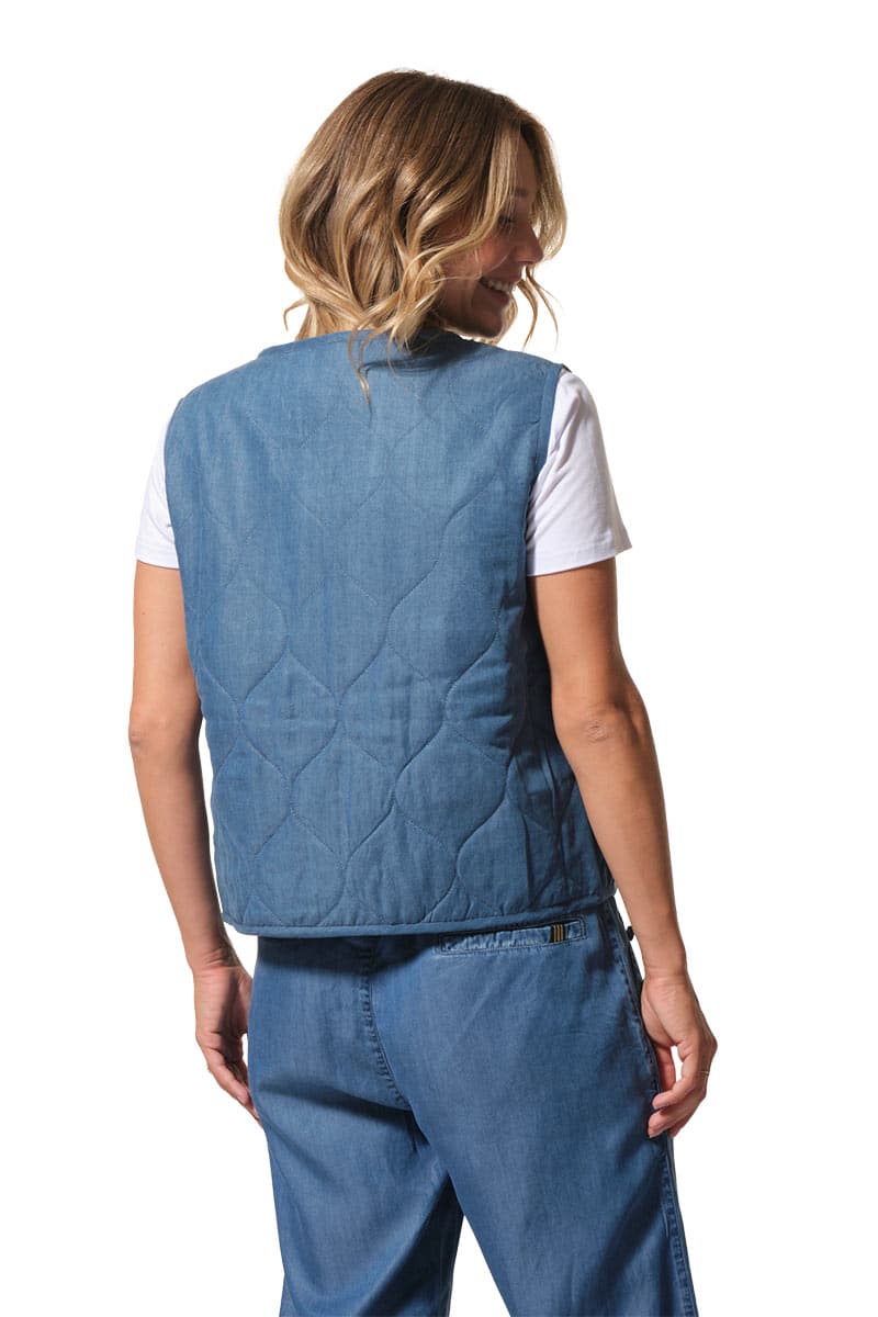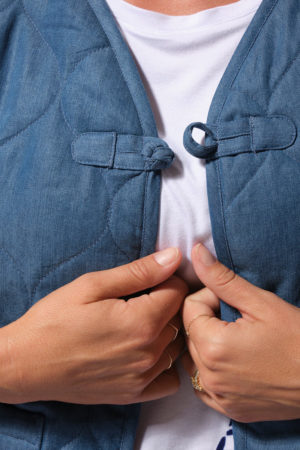 Description : Veste matelassée sans manches avec une fermeture fantaisie par brandebourg.
