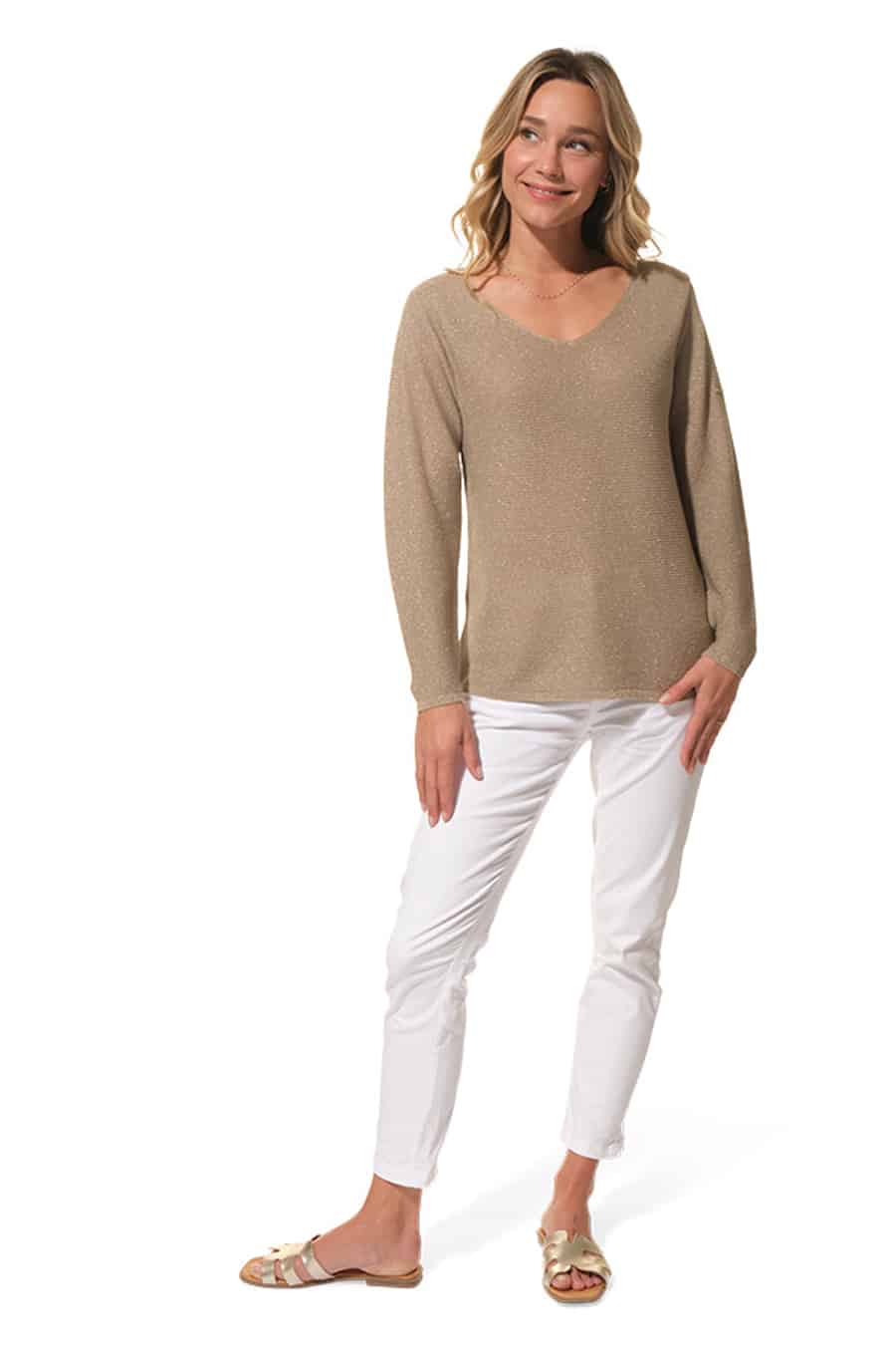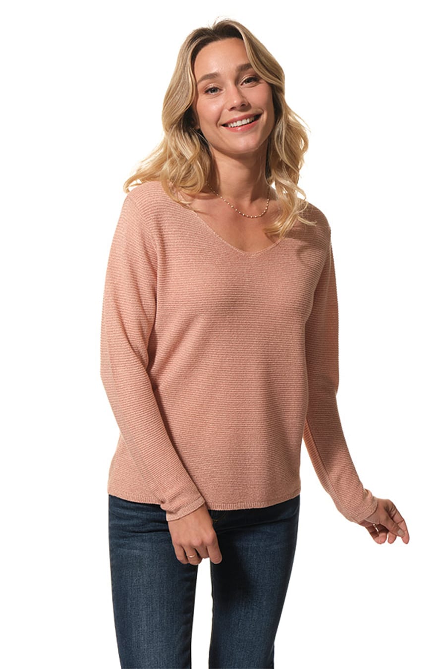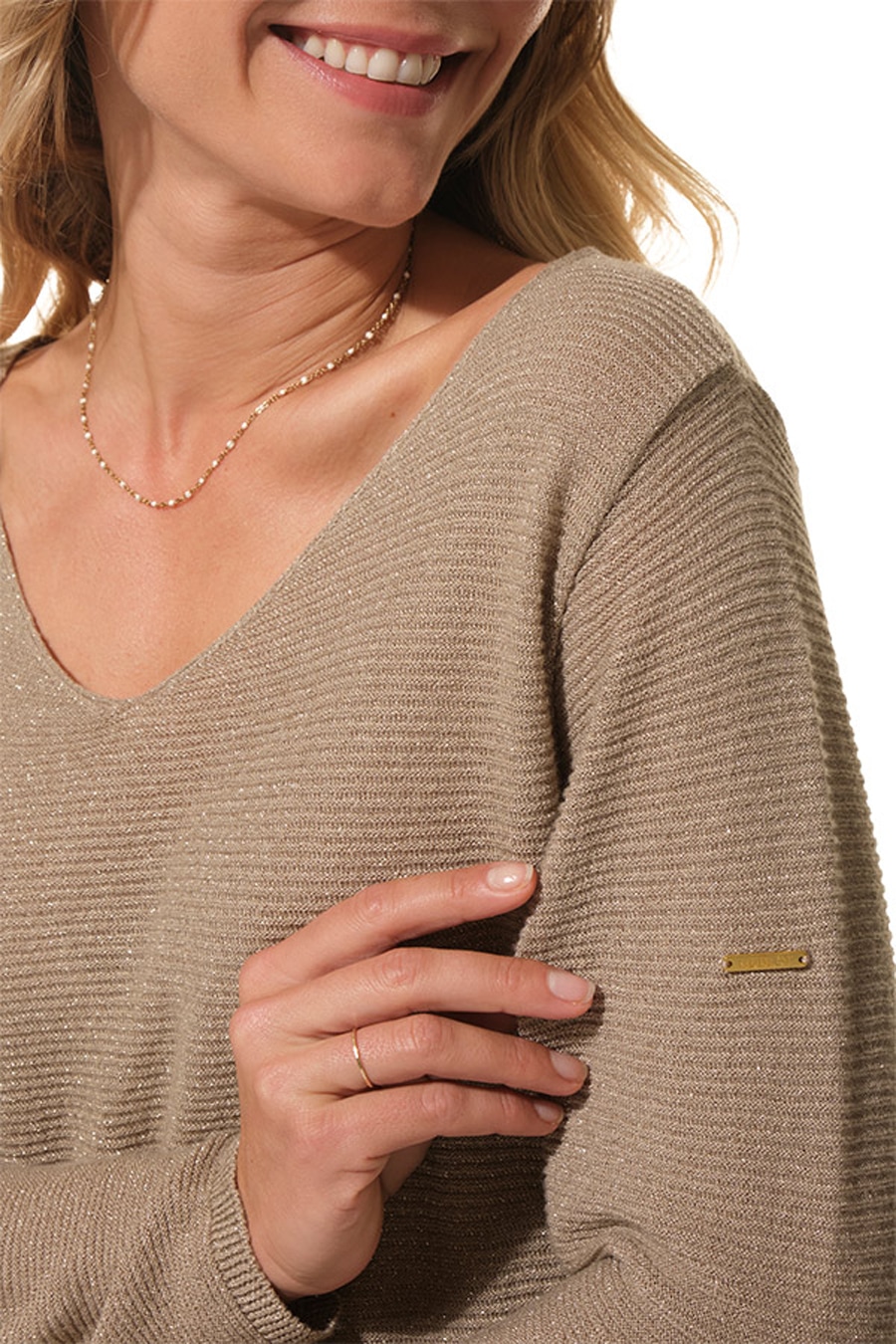 Description : pull col V en maille fantaisie avec un fil métallisé.