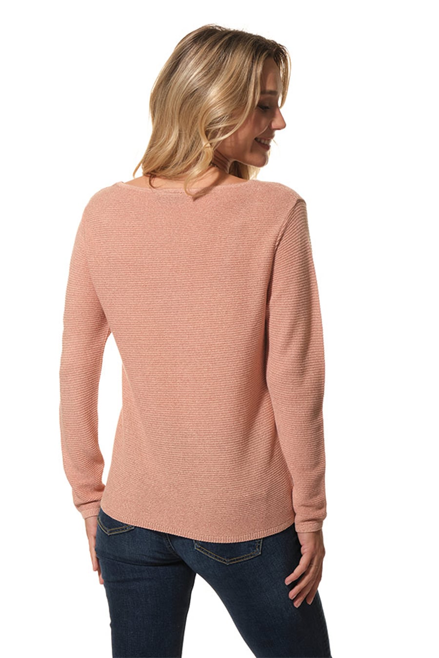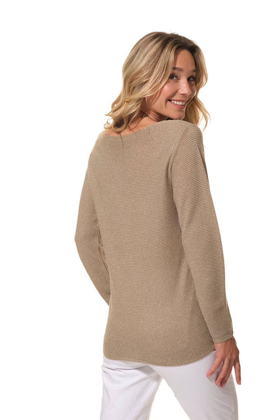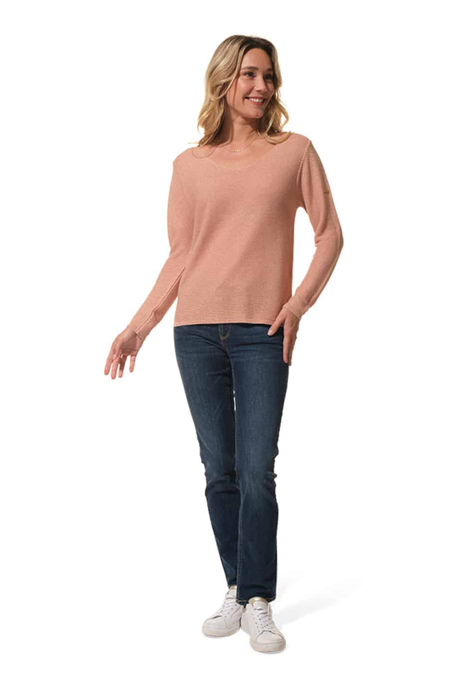 Description : pull col V en maille fantaisie avec un fil métallisé.
