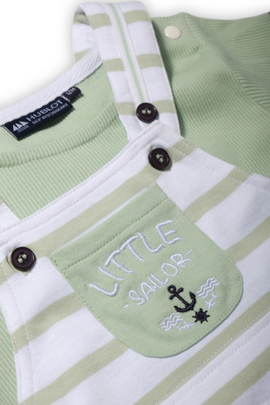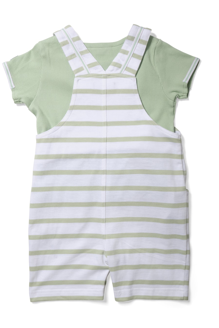 Description : Ensemble composé d’un tee-shirt à manches courtes et d’une salopette rayée.